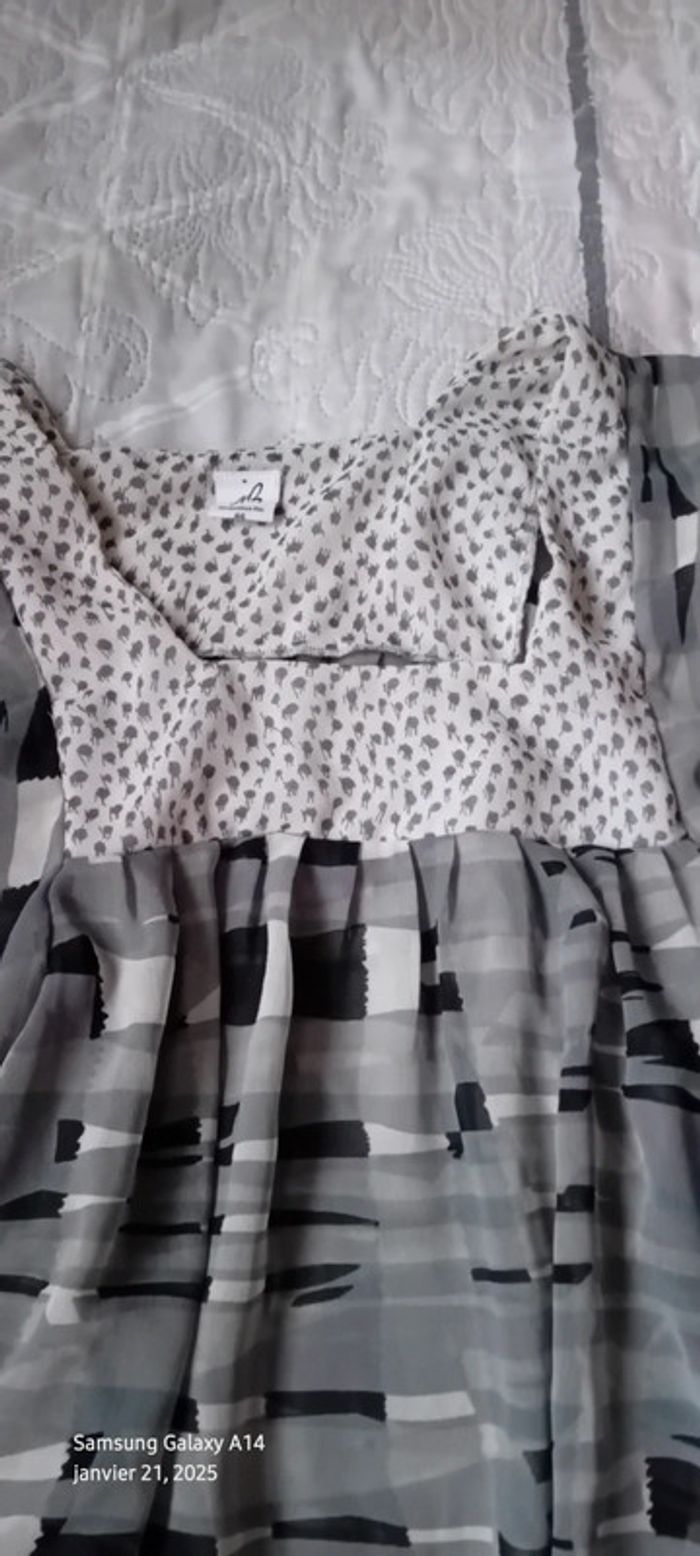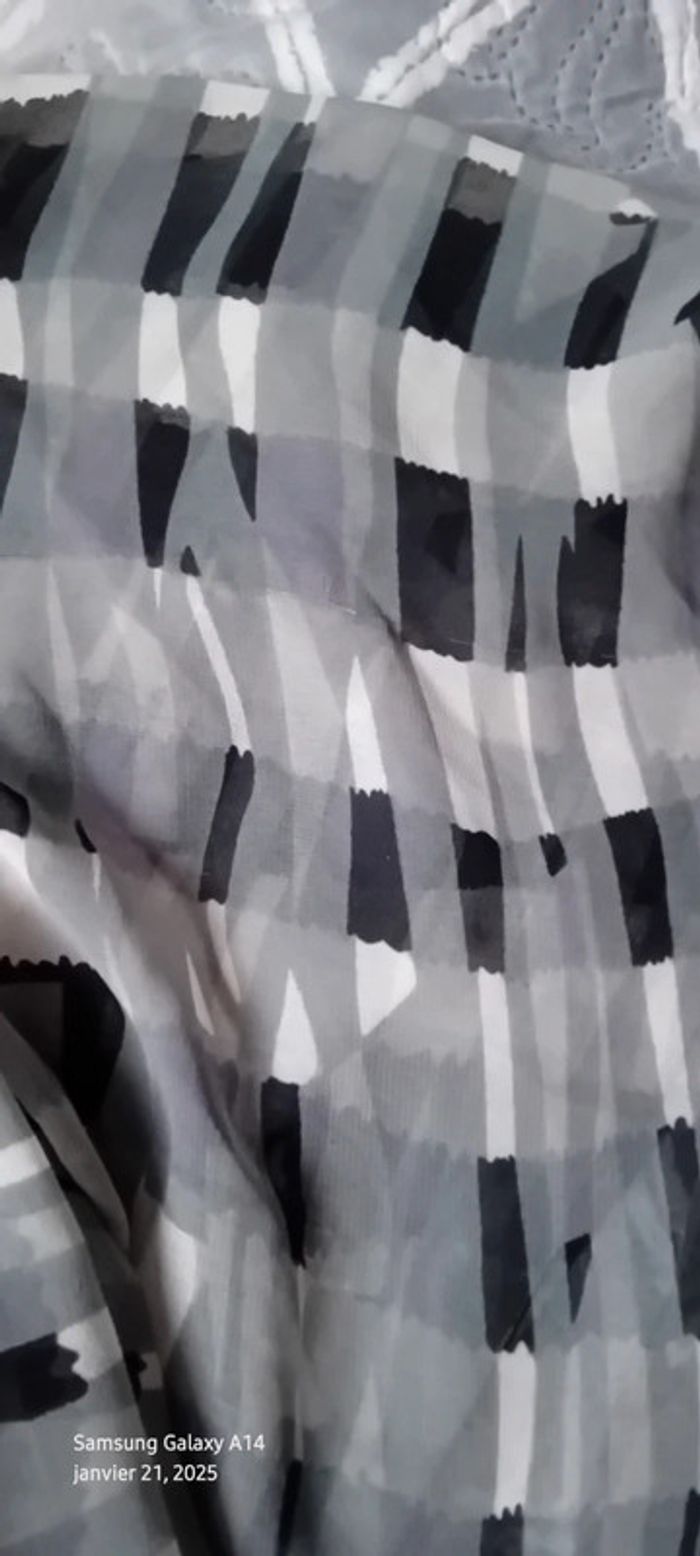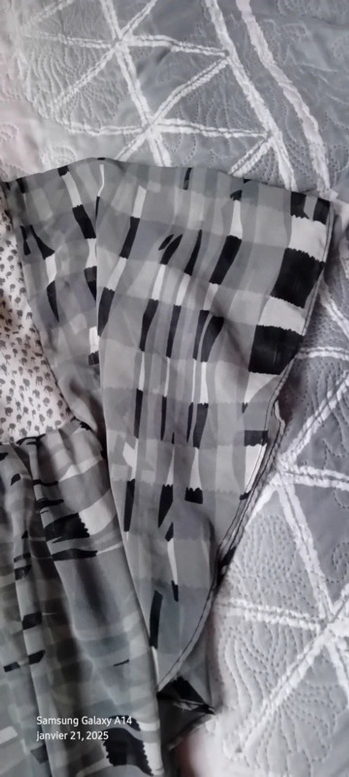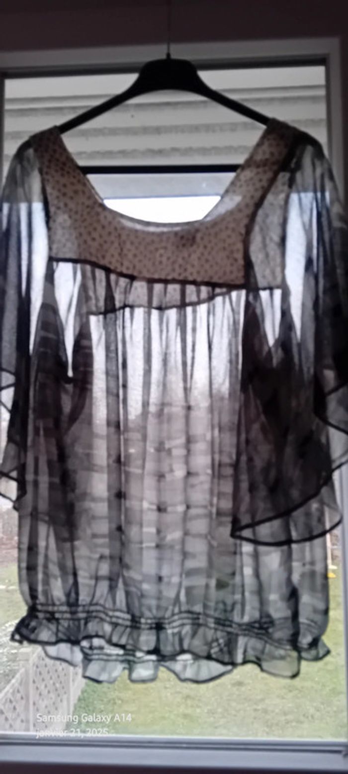 Blouse en polyester aspect voile manches courtes et larges chauve souris volantées motif abstrait traits noir blanc gris bas resseré élastique longueur 72 vm largeur aisselles à aisselles 62 cm largeur épaules 58 cm taille 46 très peu portée en très bon état #midole #midolefemme #midolefemme46 #blousefemme46 #blousemancheschauvesouris #blousemancheslarges #blousemotifabstrait #femme46 #blousejacquelineriu #jacquelineriu #gris