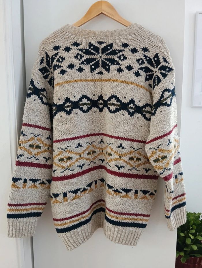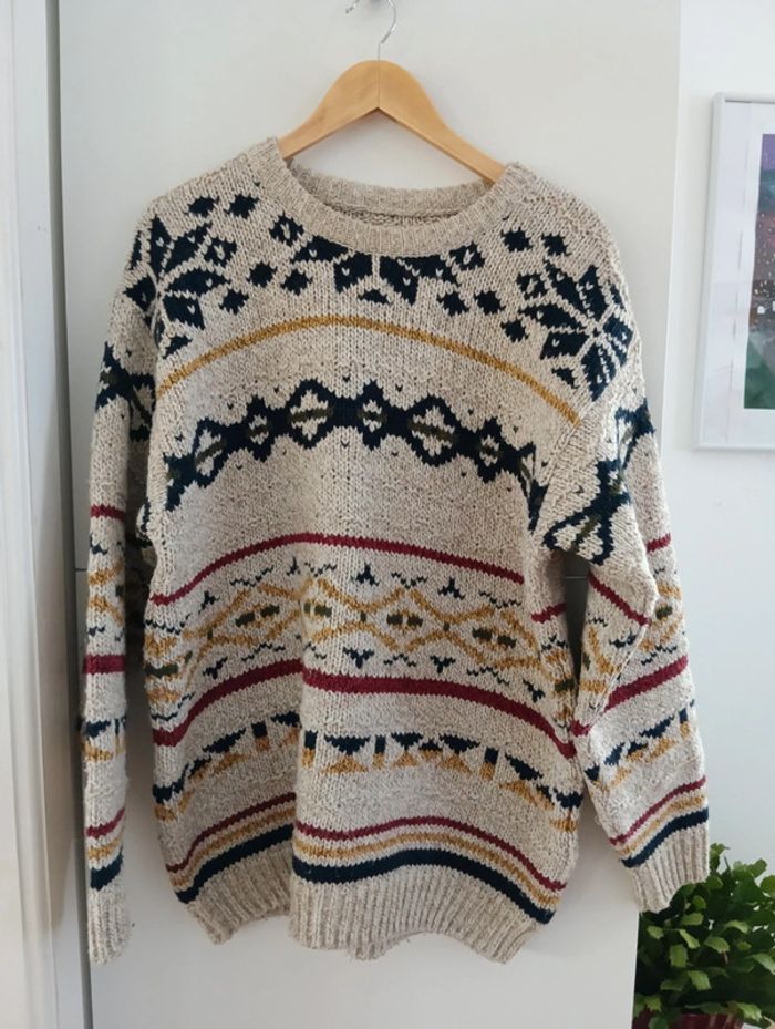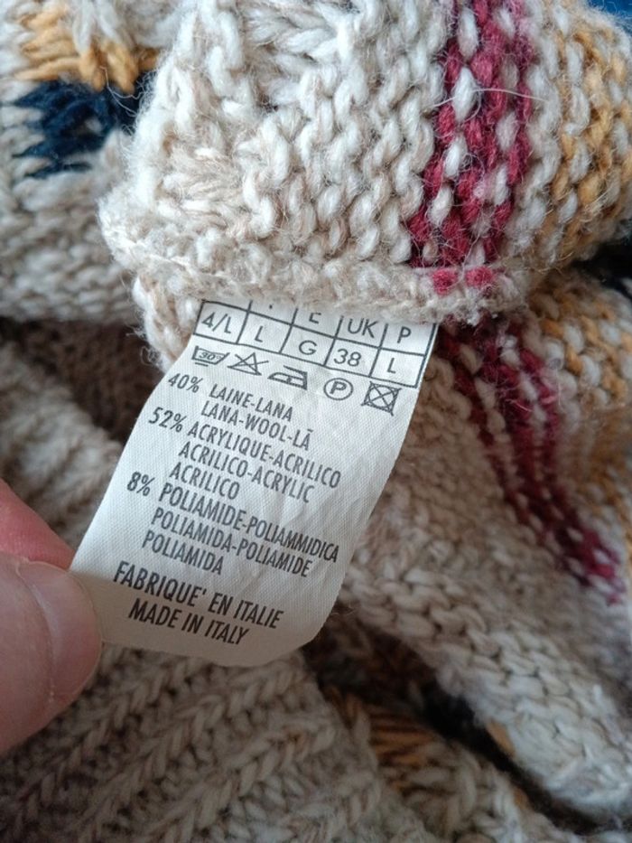 Pull vintage beige à motifs colorés . Made in Italy 40% laine Taille XL estimée bien que L indiquée à confirmer avec les mesures. Mesures Epaules 54cm Aisselles 60cm Longueur 72cm