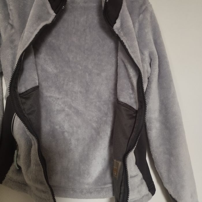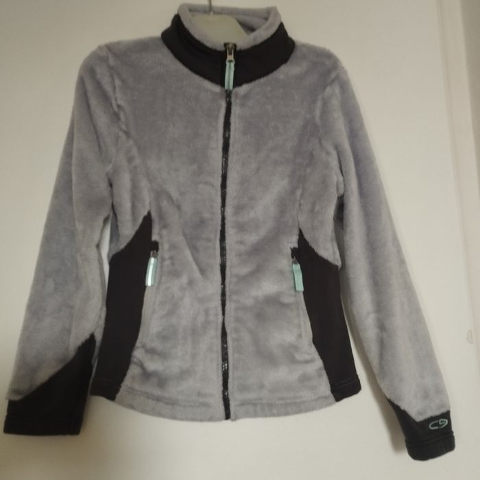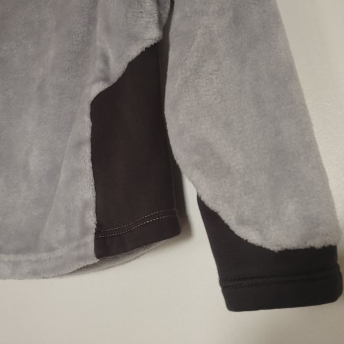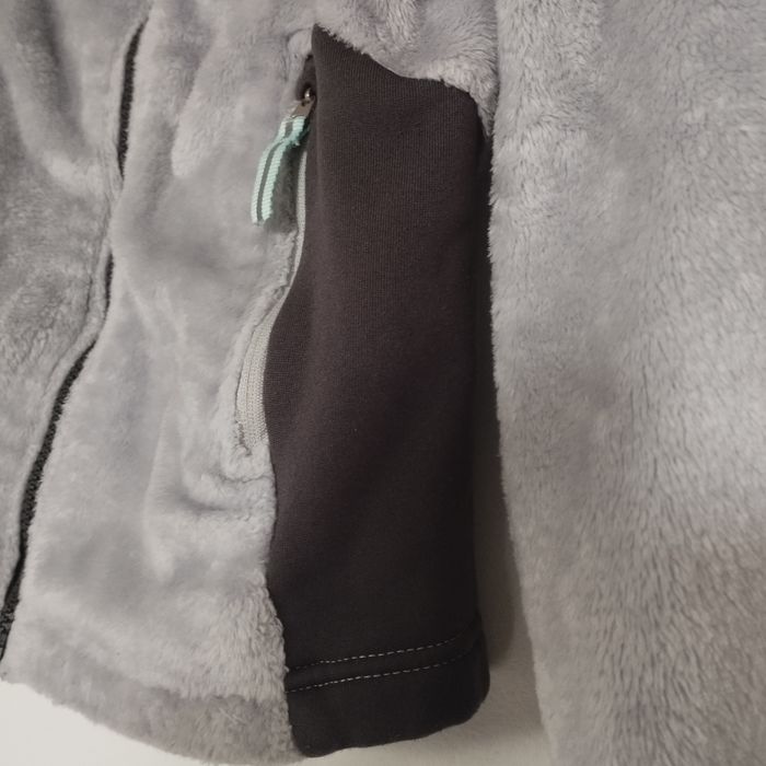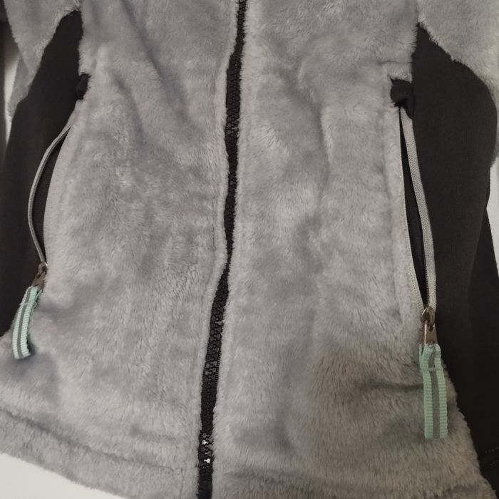Veste fausse fourrure pour enfant de 7-8 ans de chez Champion. Fermeture éclair. 2 poches avant fermées par fermeture éclair et 1 poche intérieur. Coloris gris clair et gris foncé. 94% Acrylique 6% Spandex . Comme neuf