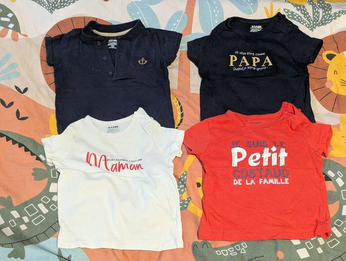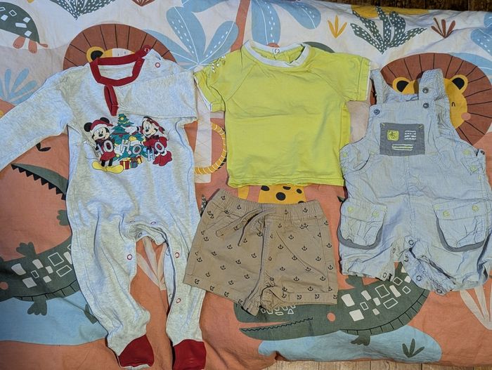 Vêtements en très bon état en taille 9 mois de différentes marques notamment Kiabi, Orchestra et Disney : - 3 t-shirts manches courtes - 1 short neuf jamais porté - un ensemble t-shirt salopette - 1 pyjama 4€ le lot