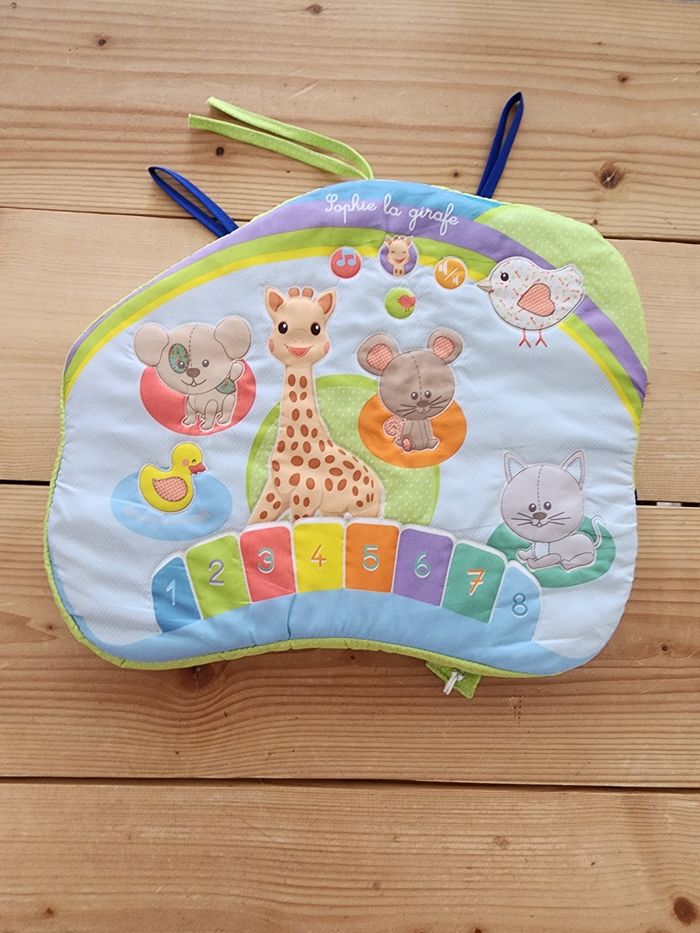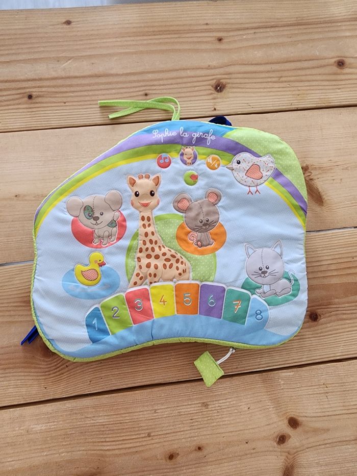 Cousin éveil bébé sophie la Girafe Fais du bruit quand on appui dessus Peu se fixer au lit, au lit ou juste le poser sur le sol. Il est deousable pour le mettre à laver En parfait état