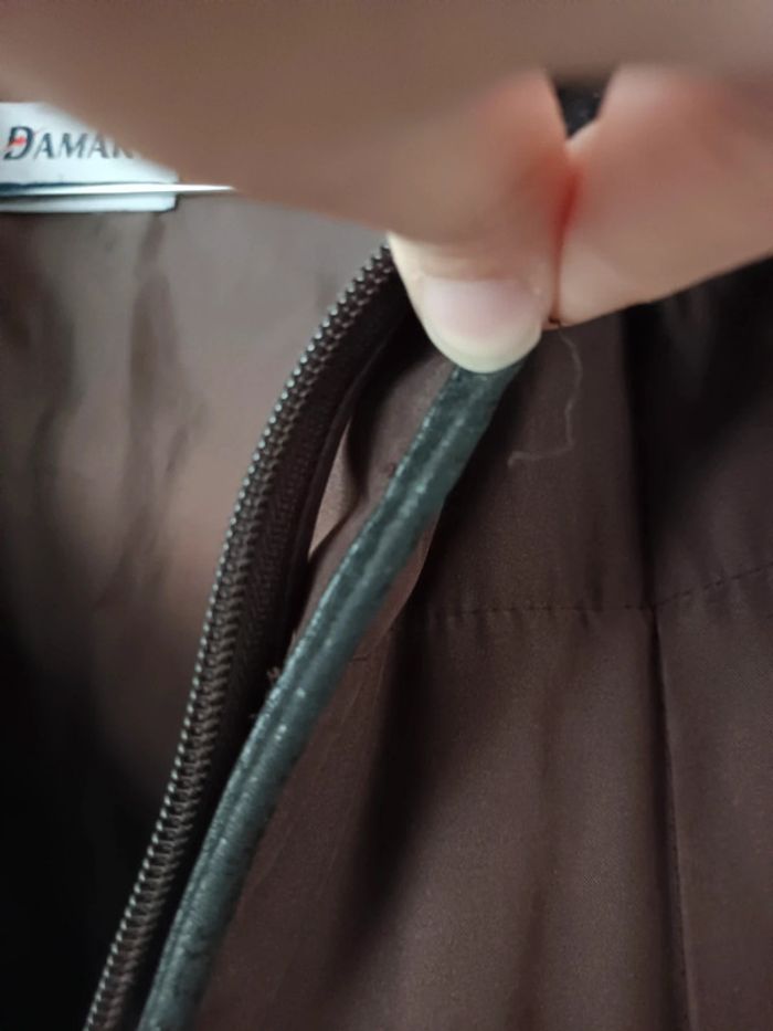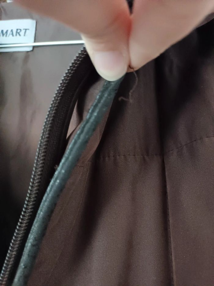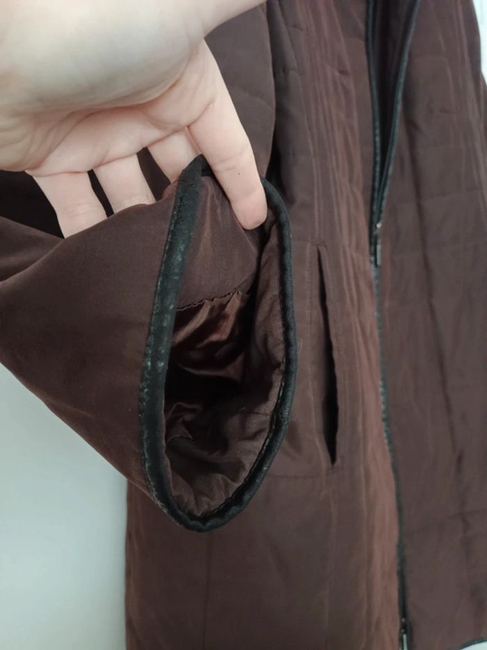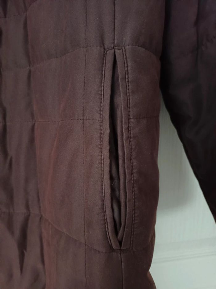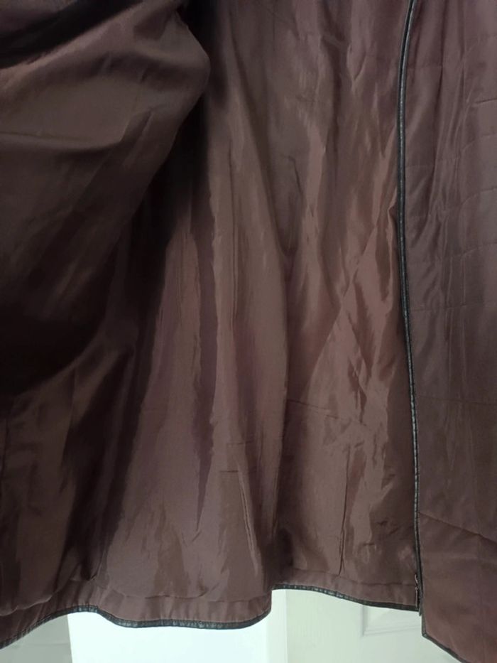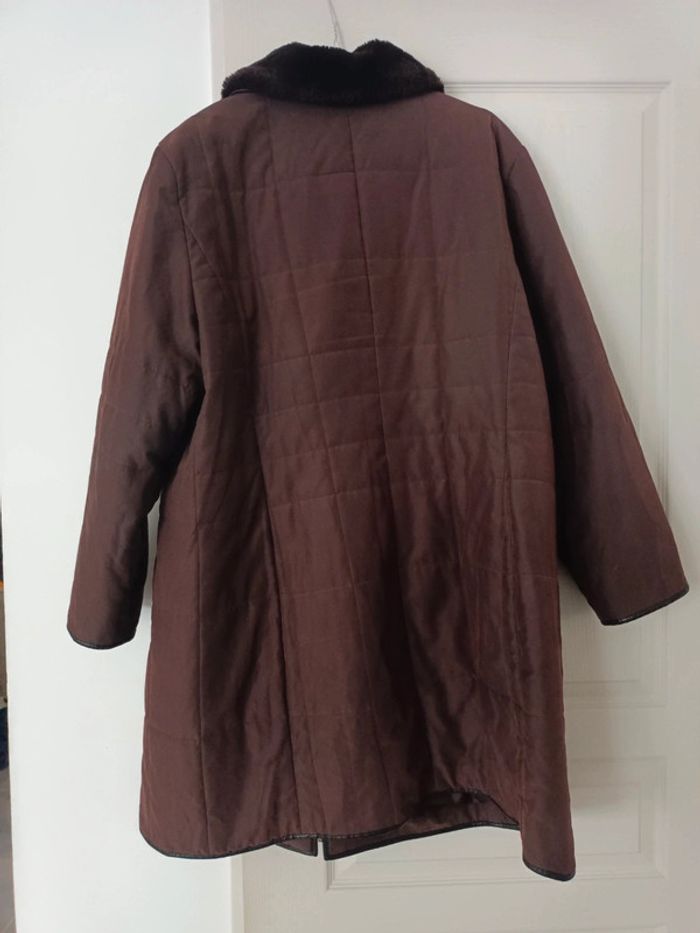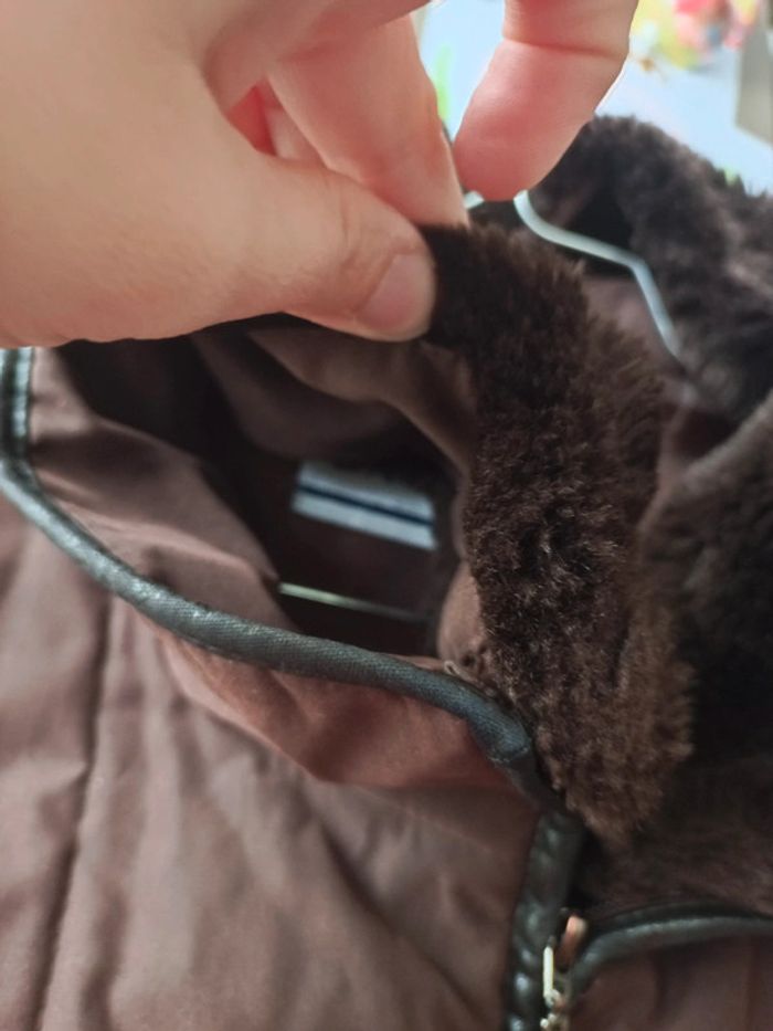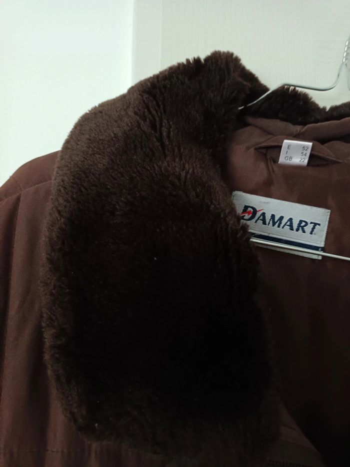 Manteau marron avec fausse fourrure amovible par boutons, taille 50, en très bon état, doublure ok. Pas de tâches pas de trous. 2 poches extérieures, 2 intérieures avec scratch. Propre cependant ⚠️ la fermeture éclair c'est un peu décousu au niveau du col, voir photos svp.