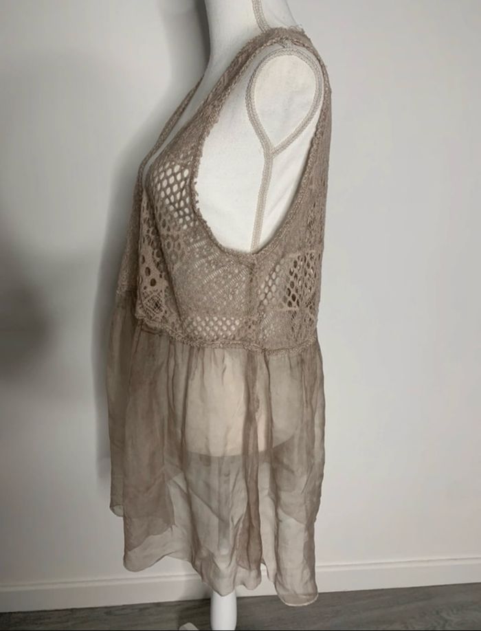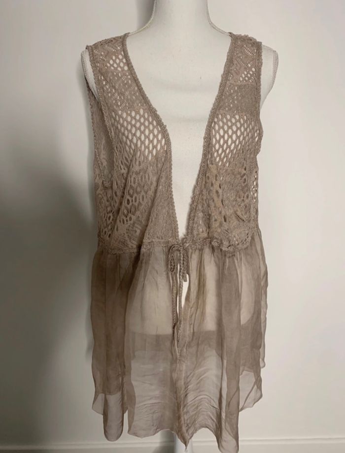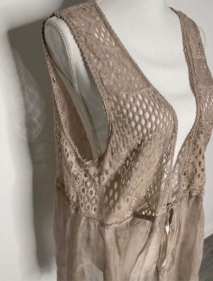 Cardigan long - Excellent état - Taille unique - Sans manche - Beige sable - Style Y2K bohème - Se ferme avec un lien - Crochet et voile - Transparent - À porter sur un pull, une robe, en paréo à la plage..