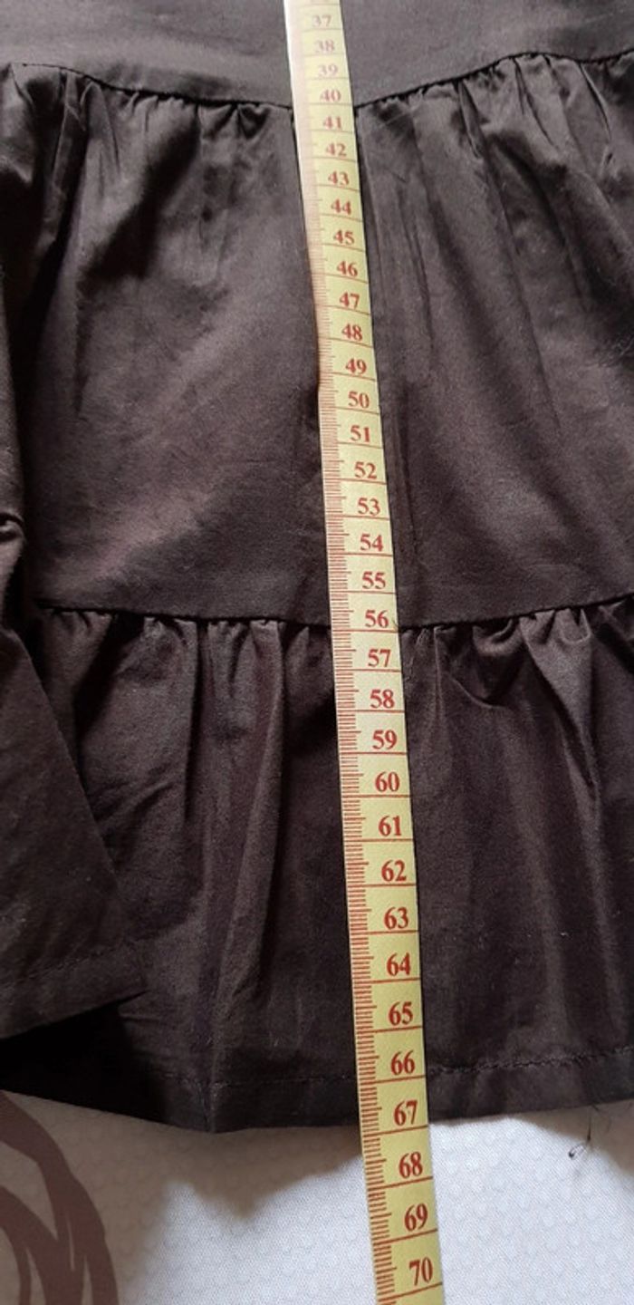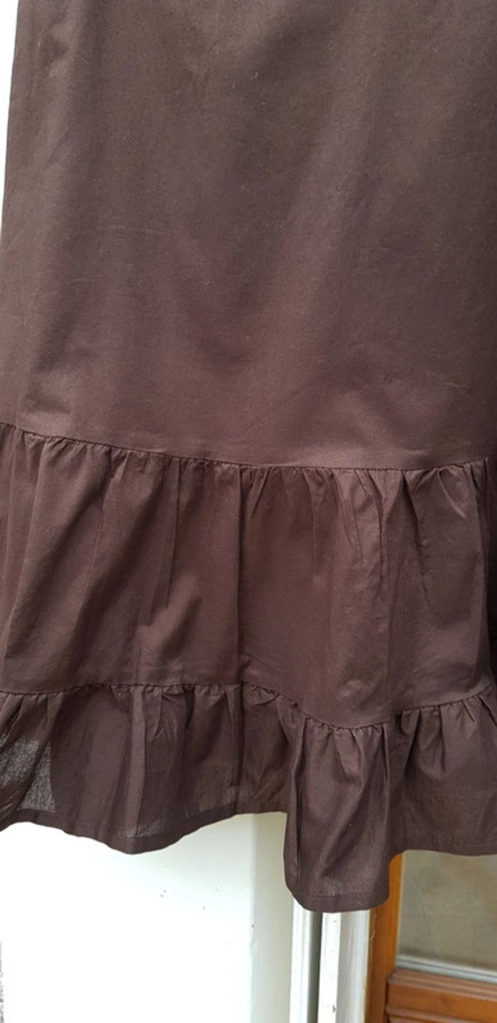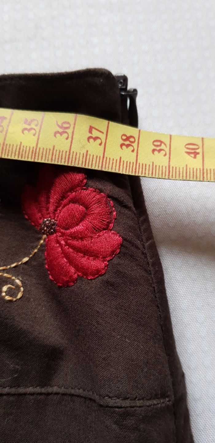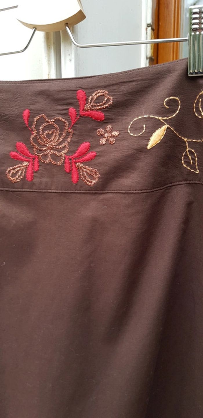 Jupe mi-longue marron avec doublure, brodée niveau ceinture, ouverture zippée sur le côté - T. 40 indiqué T. 42 mais convient plus à une taille 40 - TRÈS BON ÉTAT COMME NEUVE.