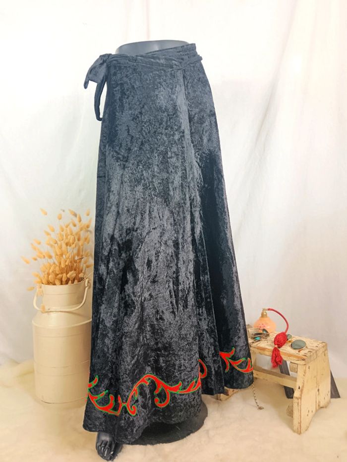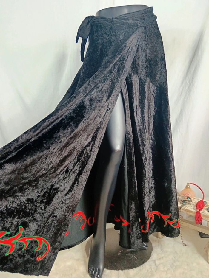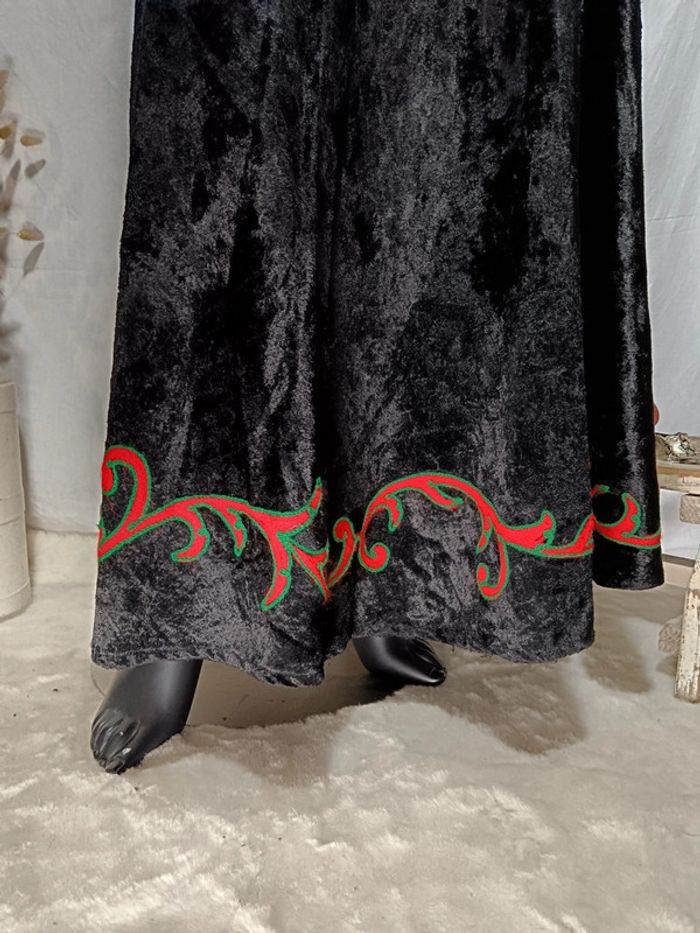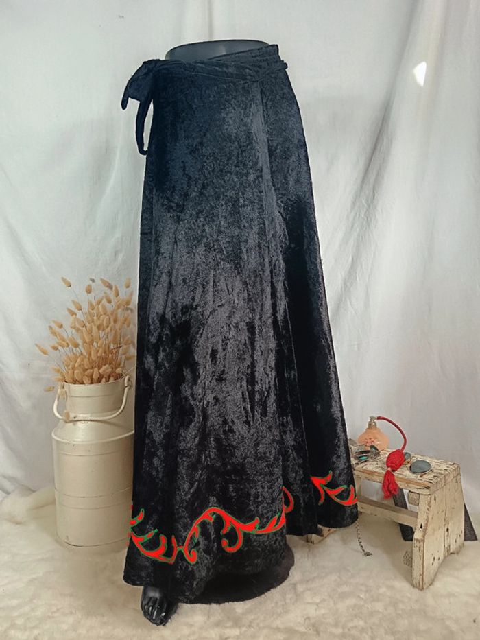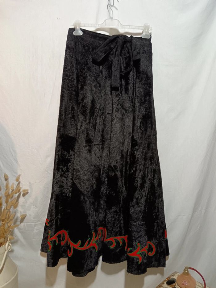 Maxi jupe portefeuille vintage en velour noir et décor brodé en bas rouge, contour vert. Taille unique elle s'adapte toutes les morphos. En taille basse, haute etc... #calm38 #calm36 #calm40 #jupeportefeuillemaxi
