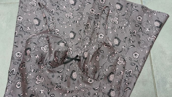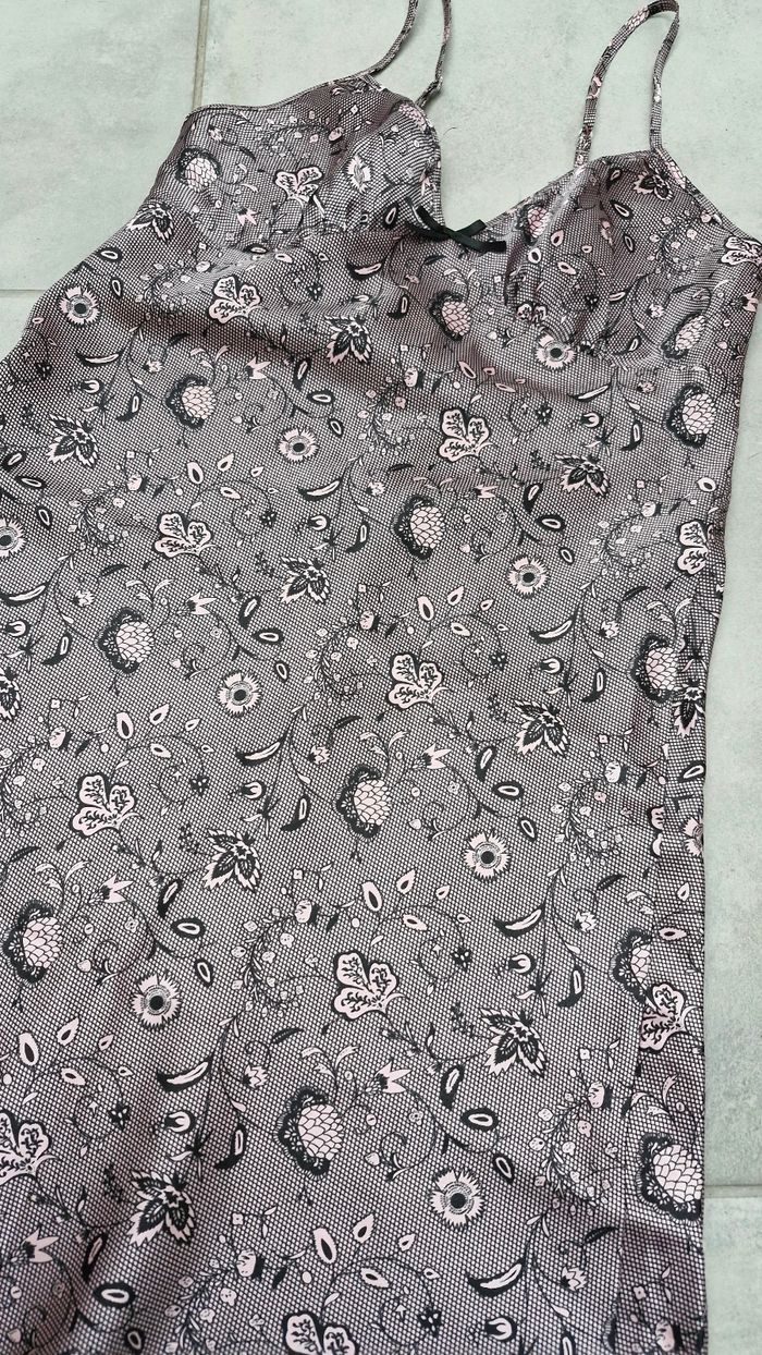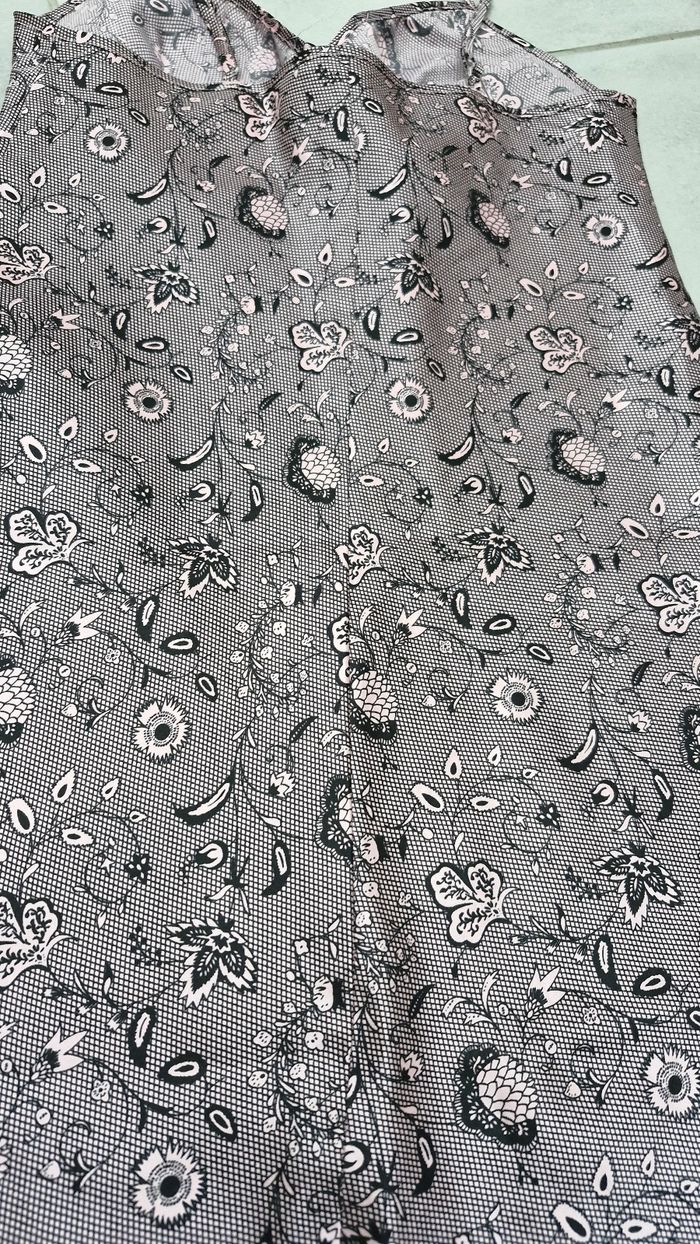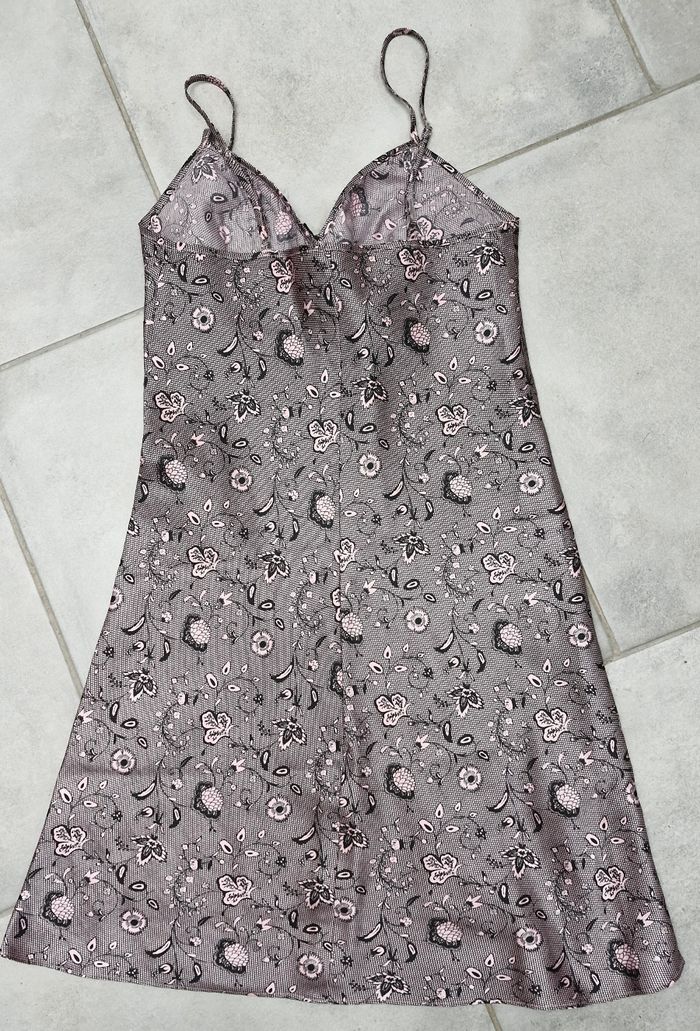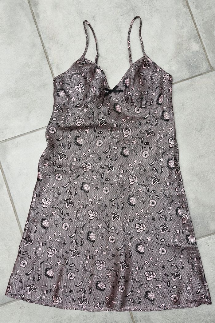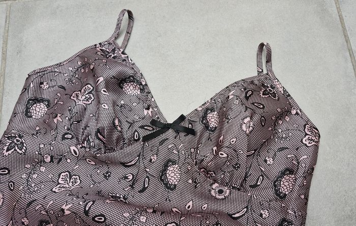 Motif végétal. Effet satin. Taille 36/38. Petit noeud noir au milieu de la poitrine. Bretelles réglables.