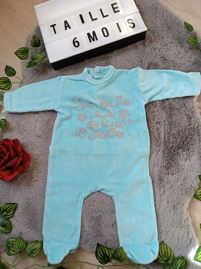 Pyjama de couleur bleu ciel Imprimé en gris"je suis la plus jolie" Ouvertures par scratch à l'arrière Texte légèrement craquelé voir photo Taille 6 mois très bon état général Mes autres articles en 6 mois : #latetelledu29fille6mois #pyjamafille #pyjamafille6mois #pyjamabébé #6moisdorsbien #dorsbien6moisfille #6moisfille #6moispyjamafille