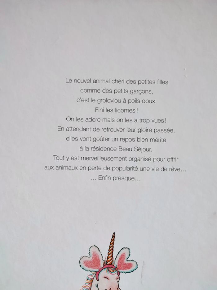 C'est officiel : le nouvel animal chéri des petites filles comme des petits garçons, c’est le groloviou à poils doux. Fini les licornes ! On les adore mais on les a trop vues ! En attendant de retrouver leur gloire passée, elles vont goûter un repos bien mérité à la résidence Beau Séjour. Piscine, spa, cours de fitness, coiffeur, esthéticienne, salon de thé, spectacles et activités diverses, tout y est merveilleusement organisé pour fournir aux licornes et autres animaux en perte de popularité une vie de rêve… … Enfin presque… remise activée sur les lots