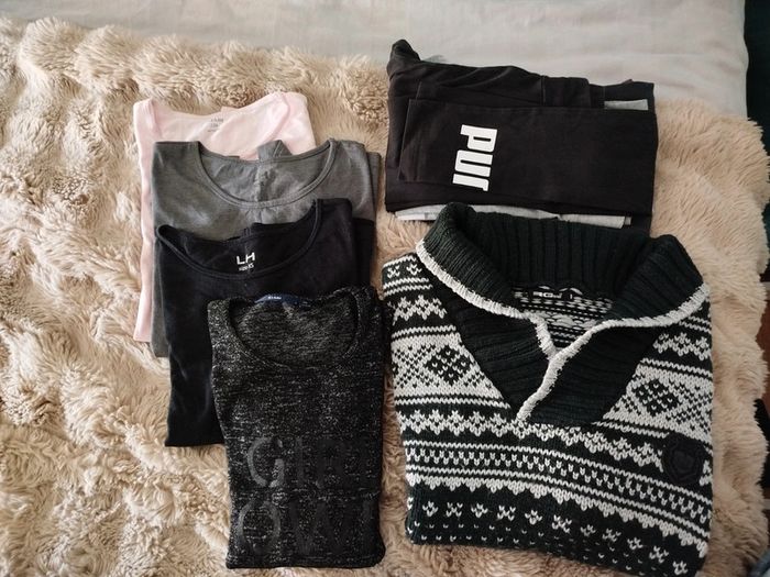 Lot xs et s (~12 ans) - 4 tee shirt manches longues tbe - 2 legging de sport taille xs / nike légèrement abîmé sur le T voir photo. Puma tbe sans étiquette. - un jogging influx basic offert car un peu boulochés. Le pull n'est plus disponible