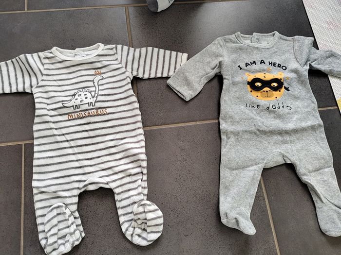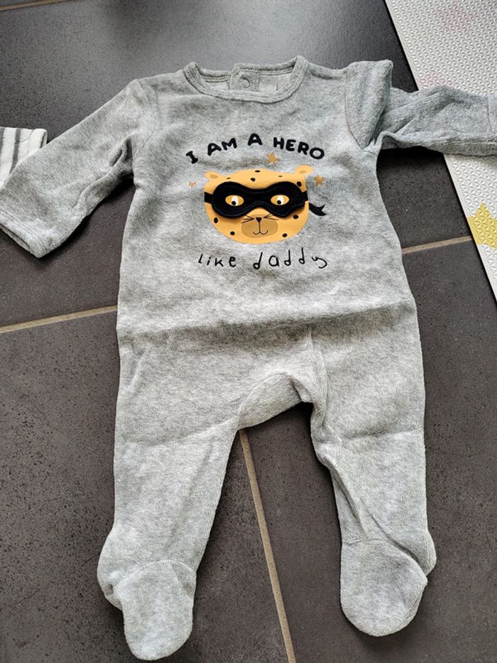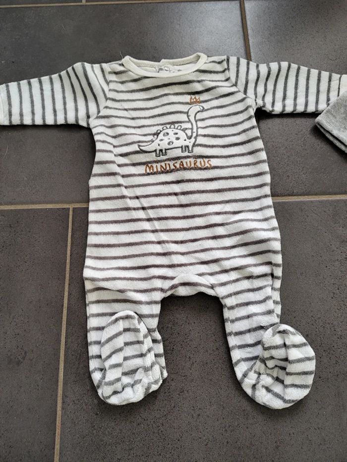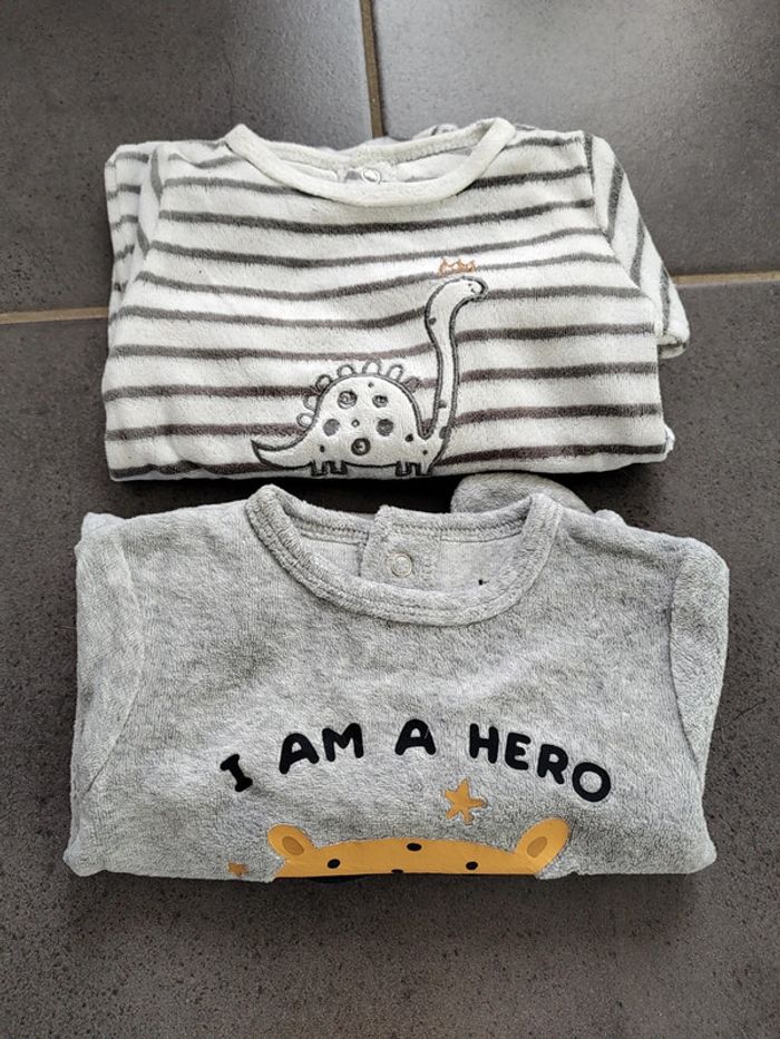 Lot de 2 pyjamas chauds composés de : • 1 blanc rayé gris dinosaure Gémo • 1 gris "i am a hero" leopard Kiabi Pressions à l'arrière Foyer non fumeur