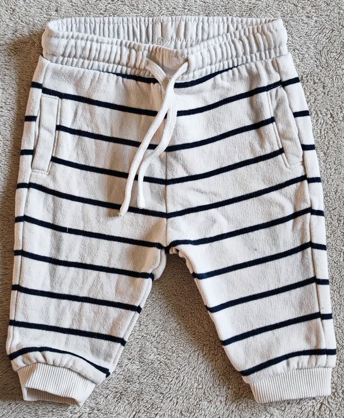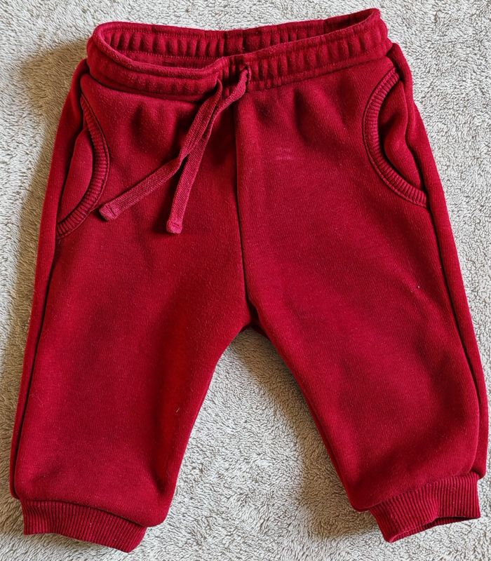 Lot de deux joggings en molleton, taille élastiqué composé d'un blanc à rayures noir et d'un rouge. Fausse poche Taille 6 mois / 67 cm / 8kg Marque Kiabi