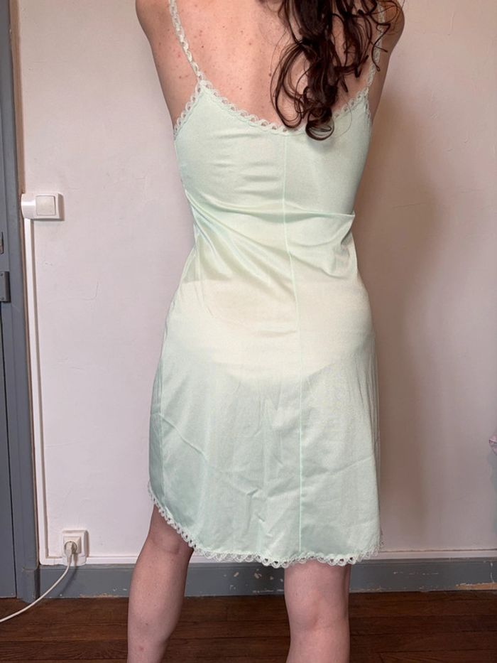 Nuisette courte vintage légère parfaite pour l’été. Très confortable et légèrement stretch. Bretelles fines et plutôt cintrée donc fait une très jolie silhouette ! Vert d’eau / pastel très bonne mine ! Ici portée sur 34 et conviendra pour 34. Je peux négocier des offres de prix si tant est qu'elles soient raisonnables (10 euros en Dessous de mon prix pour un seul article c'est trop) mais je peux faire de bonnes réductions sur les lots. Articles lavés avant envoi, emballage propre et expédition rapide. #nuisette #nuisettevintage #nuisettecoquette #coquette #coquettecore #coquetteaesthetic #slipdress #slipdressvintage #slipdressy2k