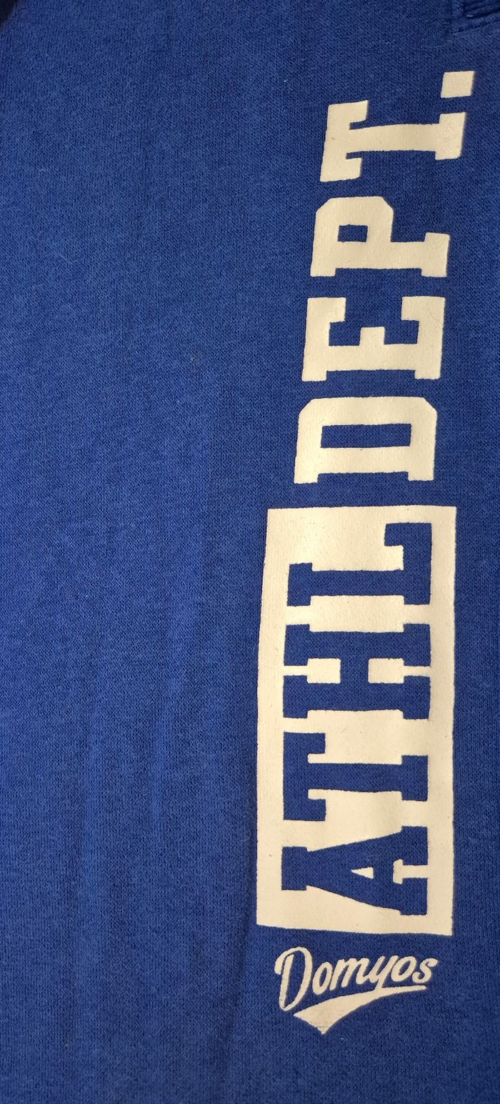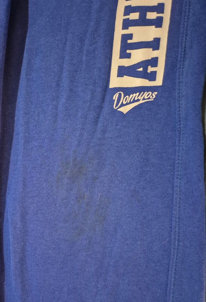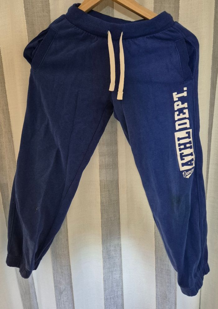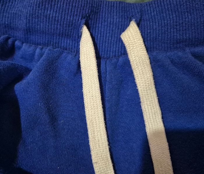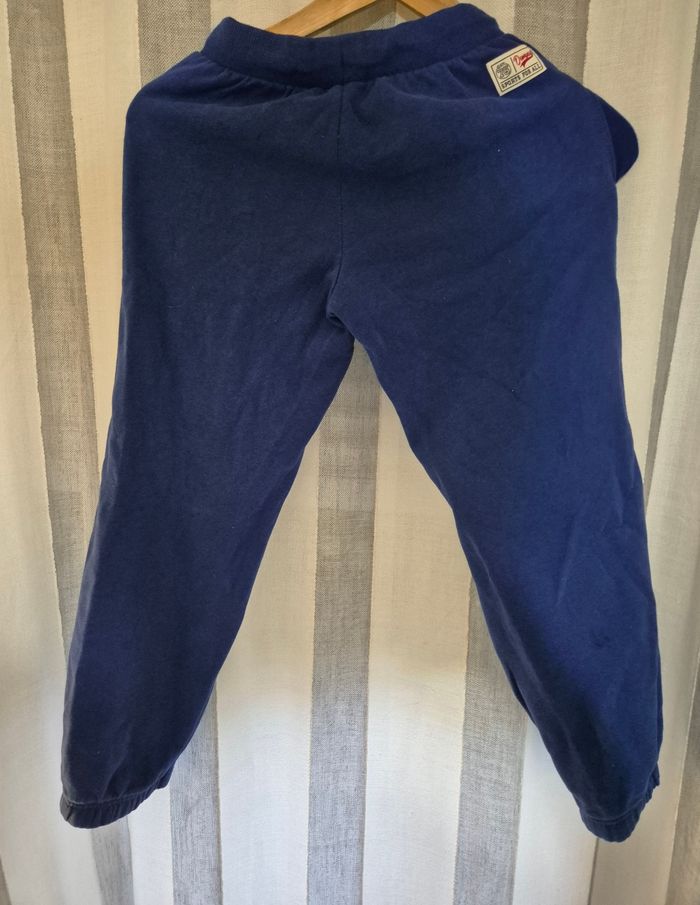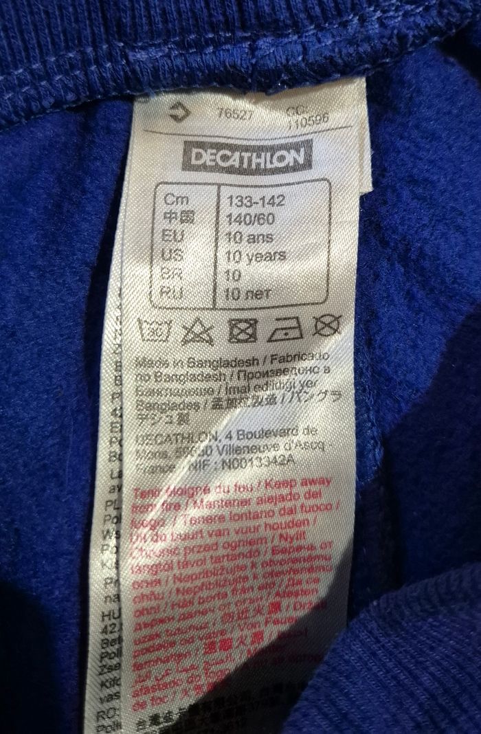 Jogging bleu Décathlon Domyos 10 ans 58% polyester 42% coton Il y a une tâche sur le genou (cf photo) Sinon très peu mis