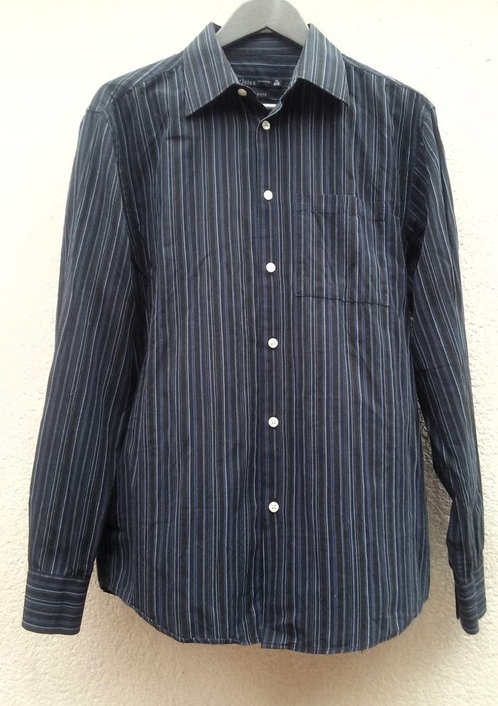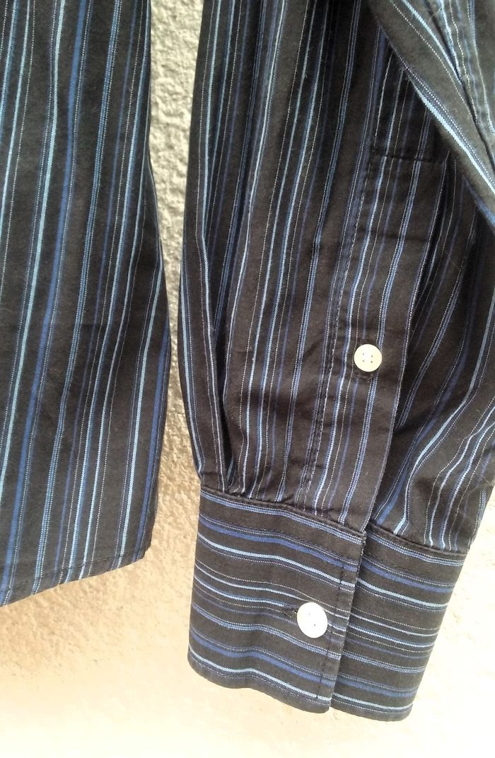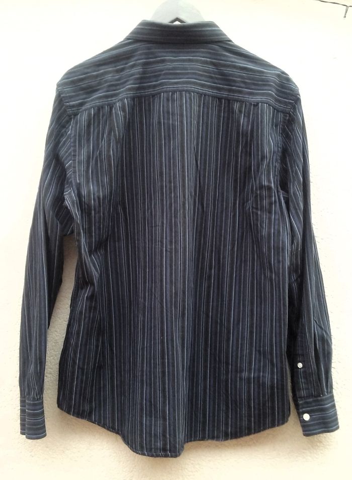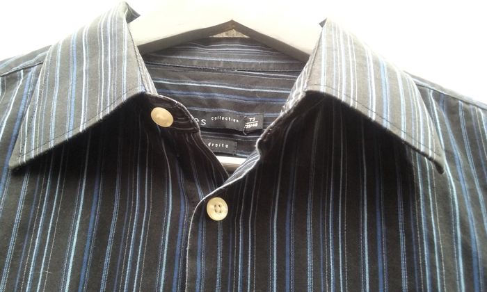 Chemise à rayures noires et bleues (différents bleus), coupe droite, 80% coton-20% polyester, un bouton de rechange, T3 (39/40). Comme neuve!