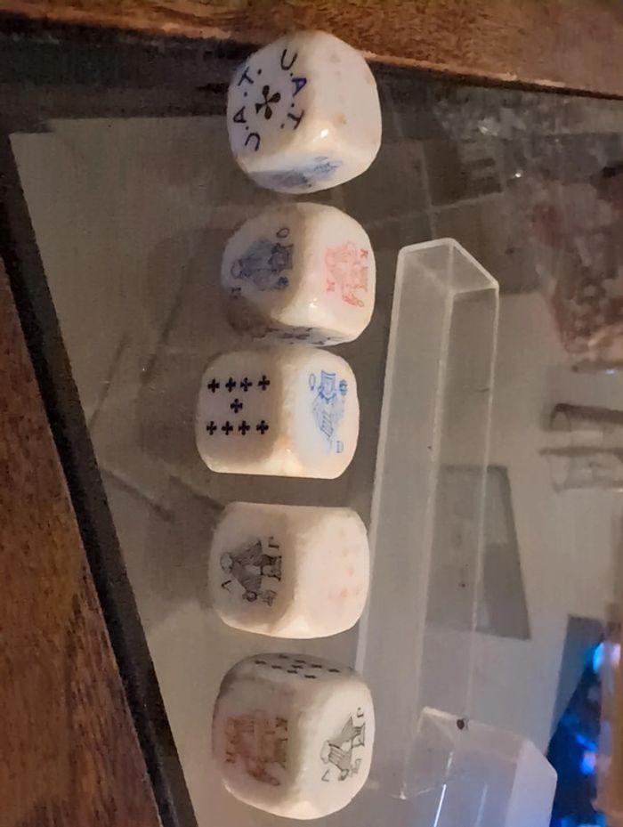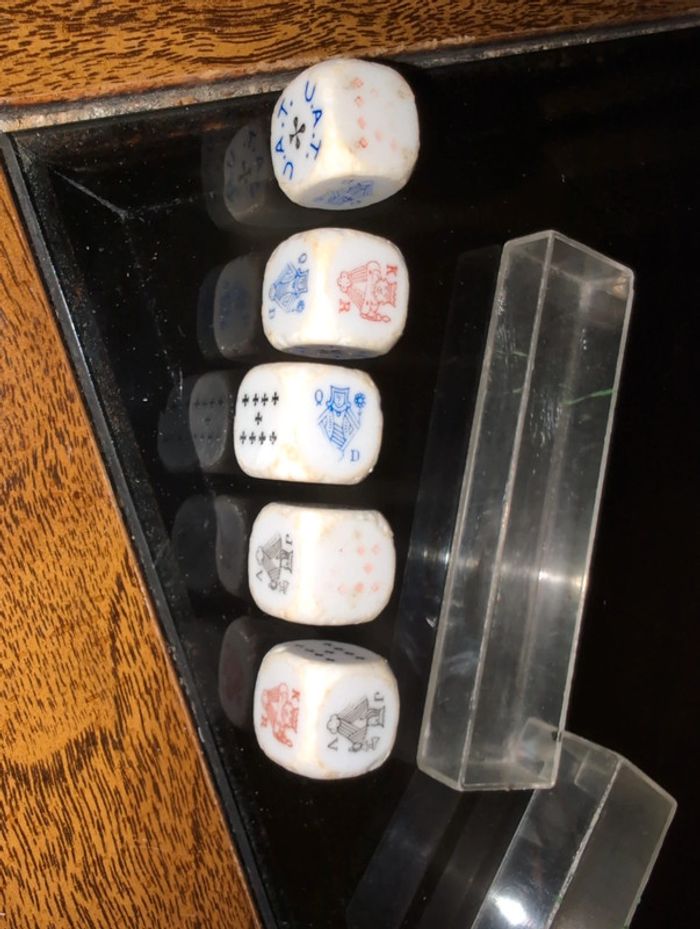Ancien dés de poker dans leur boîte en plastique Traces d'usage