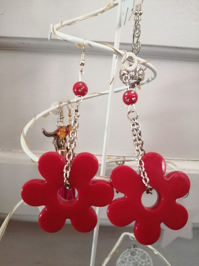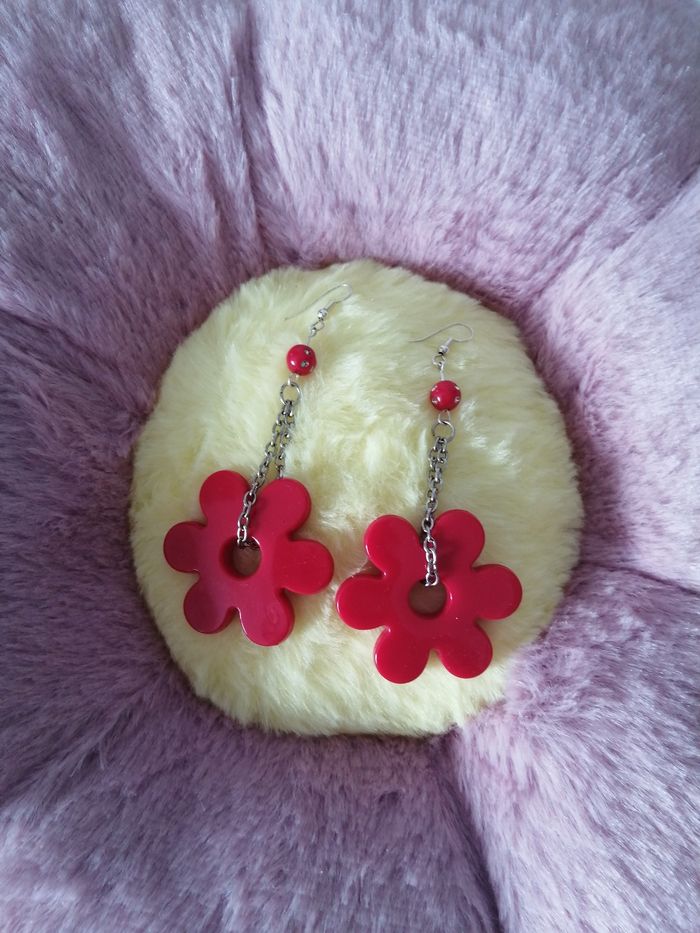 Boucles d'oreilles fantaisie Longueur totale : 9,5 cm Dimensions fleurs : 4,3 cm, matière plastique Diamètre boule : 0,5 cm, matière plastique Crochets d'oreilles sans plomb, sans cadmium, sans nickel (attention les fleurs présentent qqes rayures, voir photos) Jamais porté