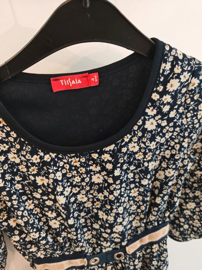 Robe longue à manches longues, bleue marine avec motifs fleurs blanches, taille 4 ans