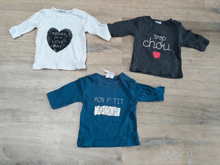 Lot de 3 tee shirts manches longues de la marque kiabi en taille 1mois. Le blanc a une légère tâches peu visible. Ils sont tous à l unité dans mon dressing si vous souhaitez plus de détails et de photos. #sdr0vetementsbebe #sdr0vetementsbebe1mois #sdr0teeshirts