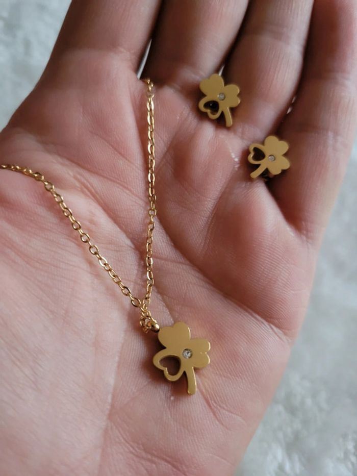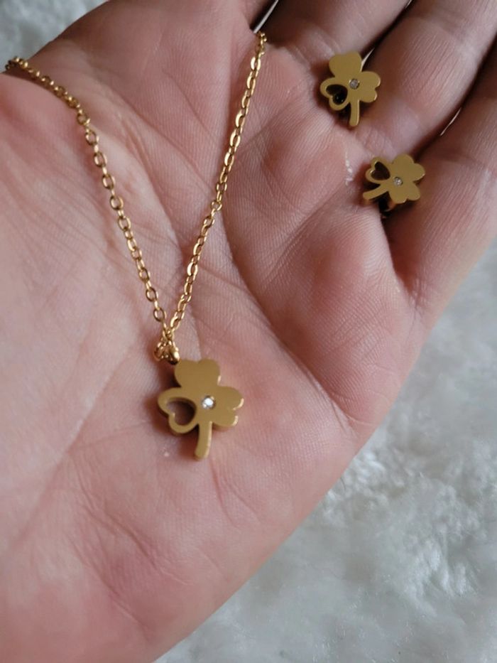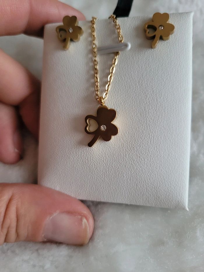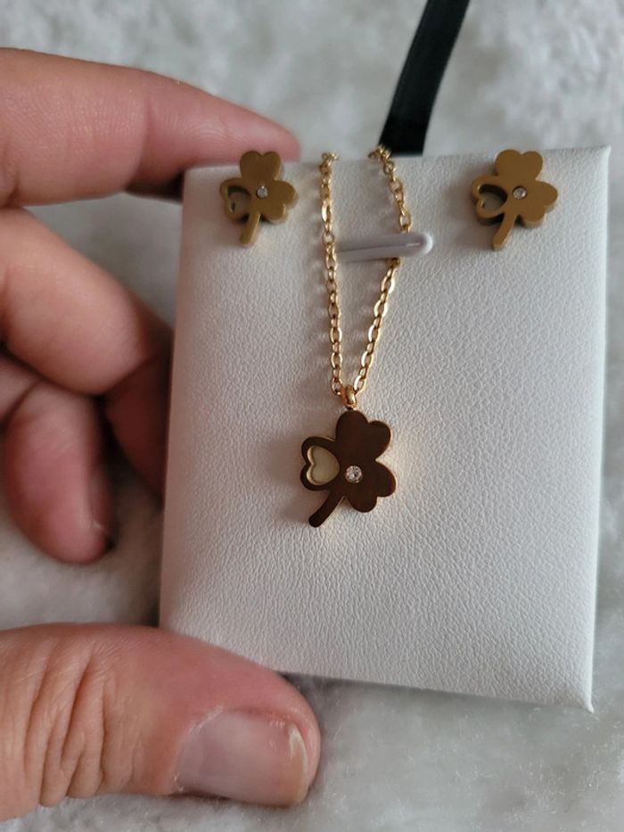 Chaine (45cm) et médaille trèfle 🍀 + boucles d oreilles (oreilles percées), en acier inoxydable doré et petits zirconiums. Hyppoallergenique Ensemble neuf. Lot possible avec différents articles de mon dressing, sur demande. Je vous préparerai une annonce personnalisée au nom de votre pseudo...🥰👌🙂 Pochette 🎁 sur demande Envoi sous 24h_48h