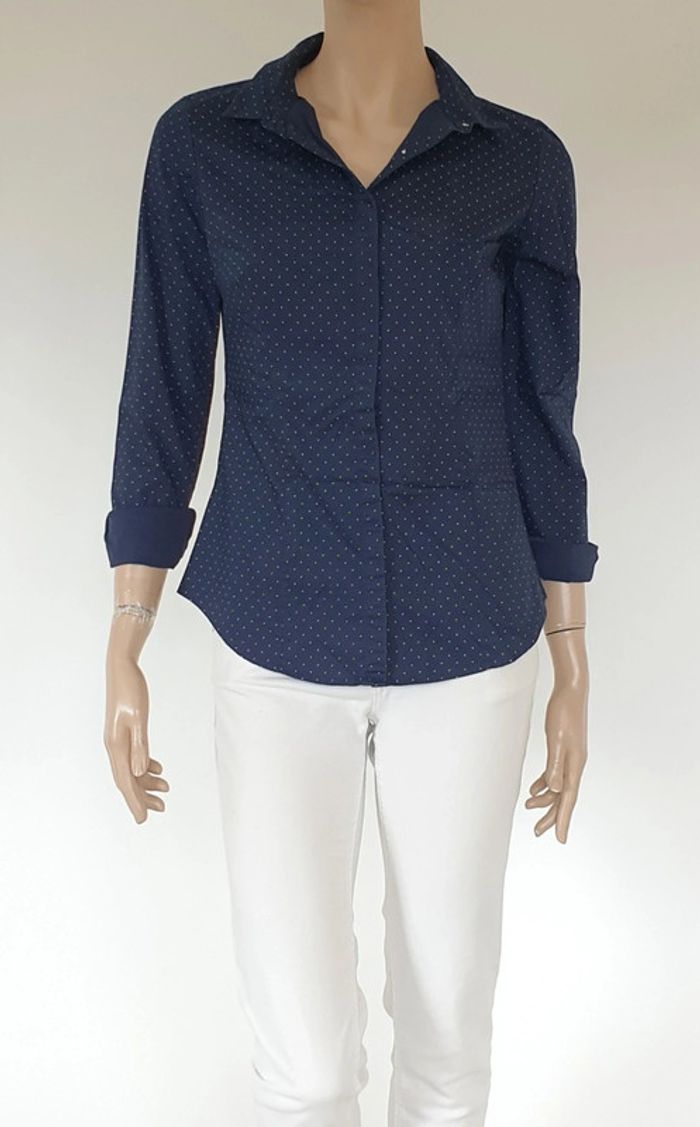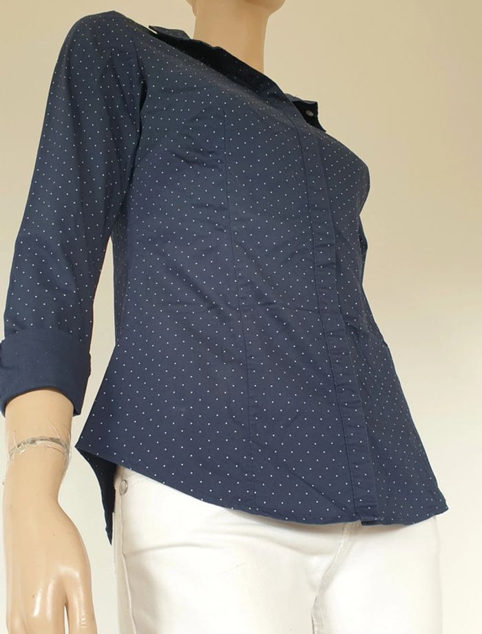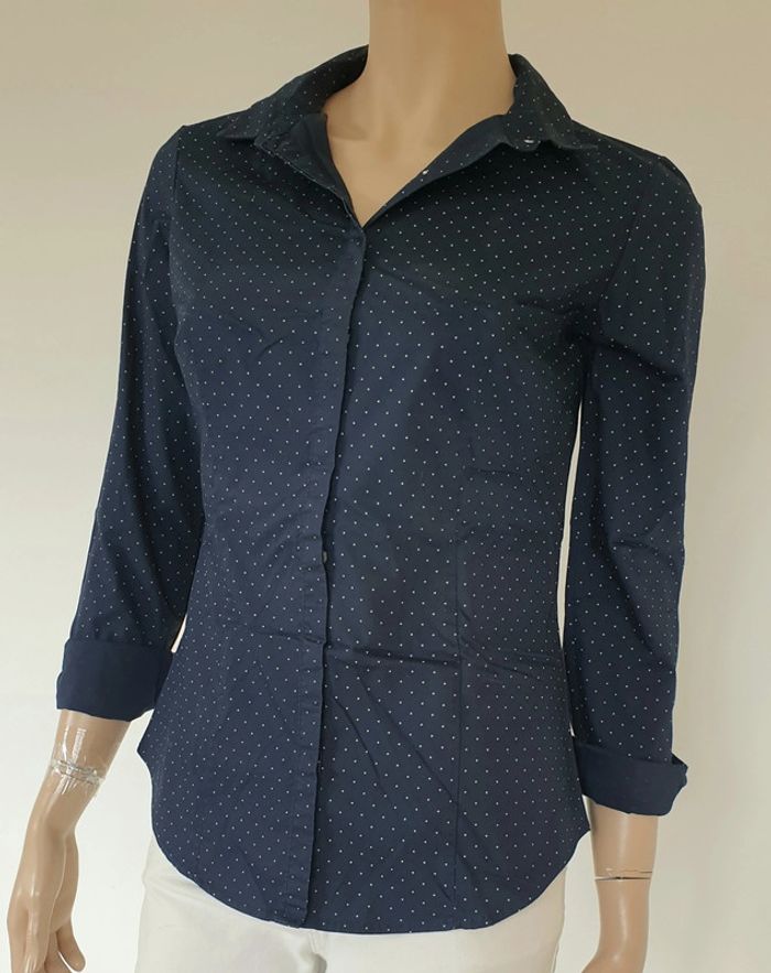Un chemisier marine à pois de 63cm de long Largeur épaules 38cm Aisselles à aisselles 46cm Coupe cintrée Kiabi Taille 36