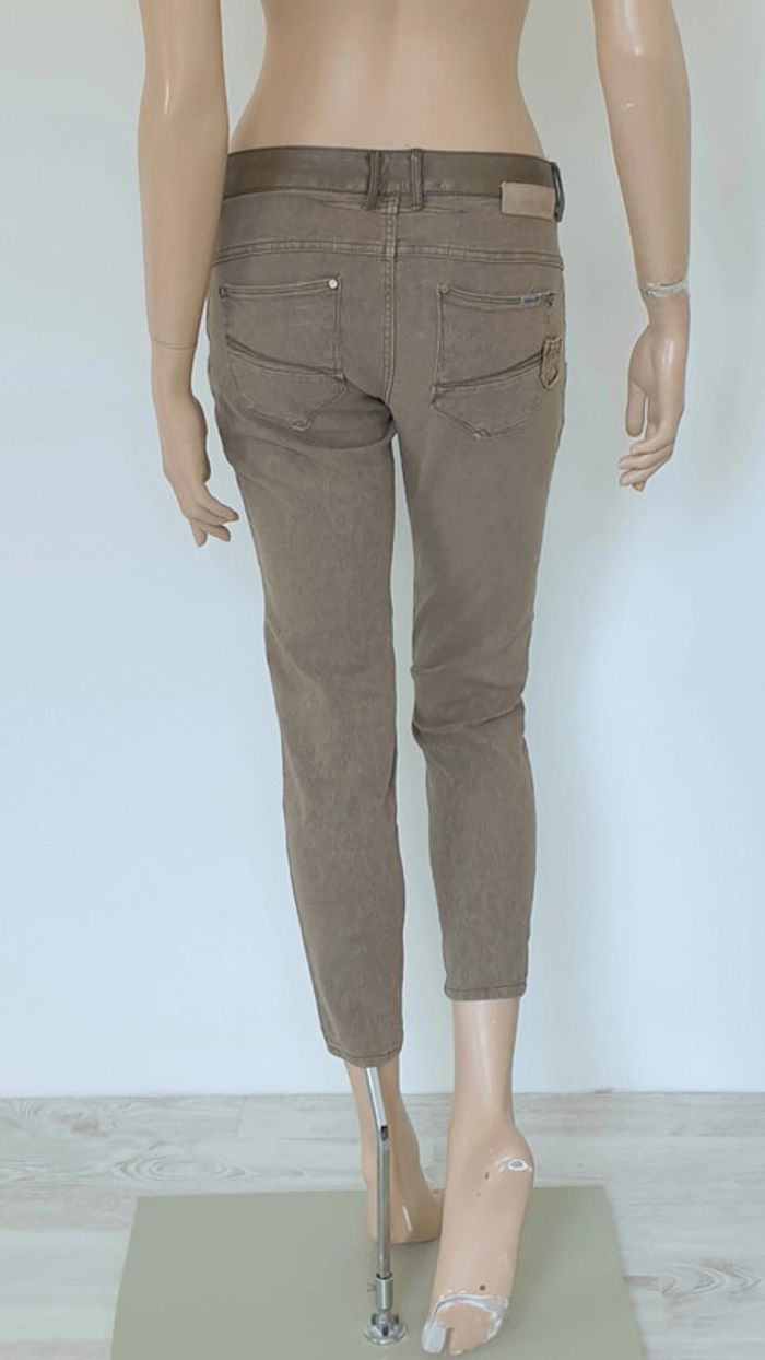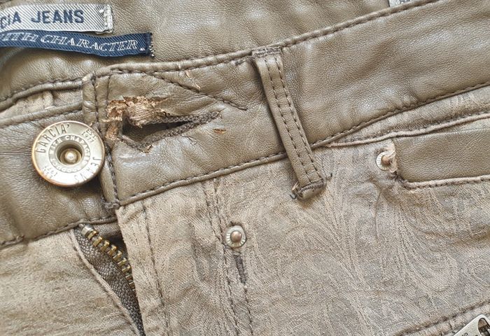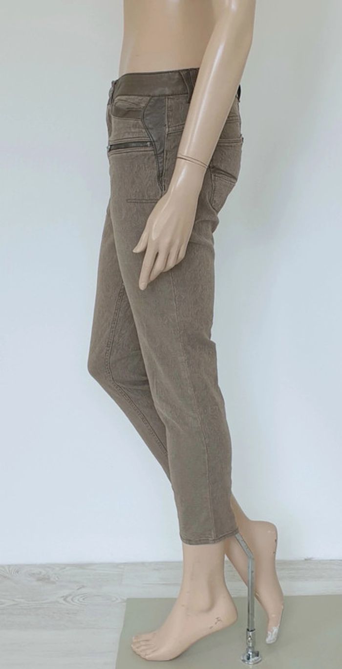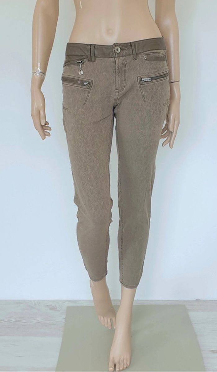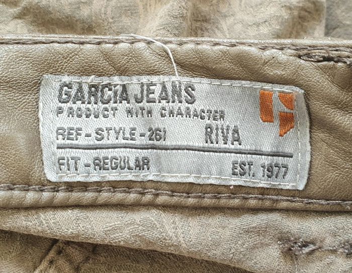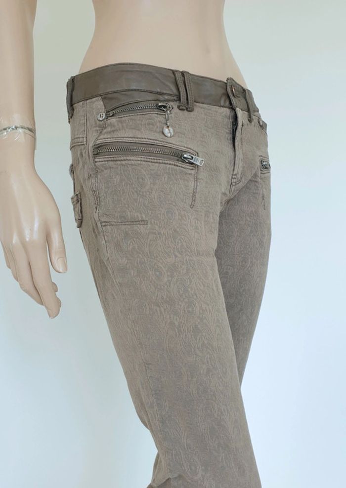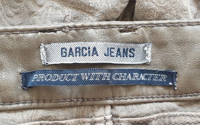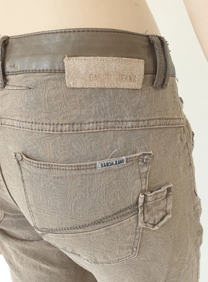 Un jeans slim marron clair à motifs de 89cm de long À partir de l'entrejambe 65cm Taille à plat 41cm Bas 14cm ⚠️ Le simili cuir de la taille est abîmé au niveau du pression de la taille et au niveau d'une des poches ( voir photo) Garcia jeans Taille 39/40