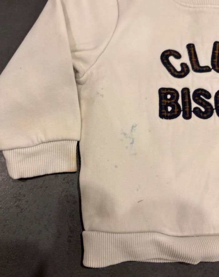 Pull 18 mois tape à l’œil tachés à plusieurs endroits (voir photo). Maison non fumeur et personne soigneuse N'hésitez pas à me demander si vous recherchez d'autres vêtements et taille.