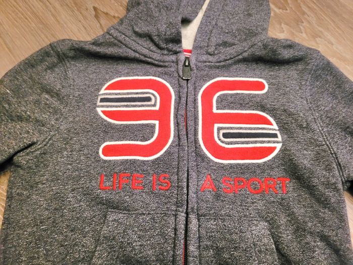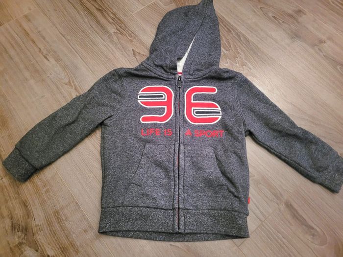 Veste à capuche bleue foncée chiné manches longues fermeture zippée marque Okaidi 3 ans