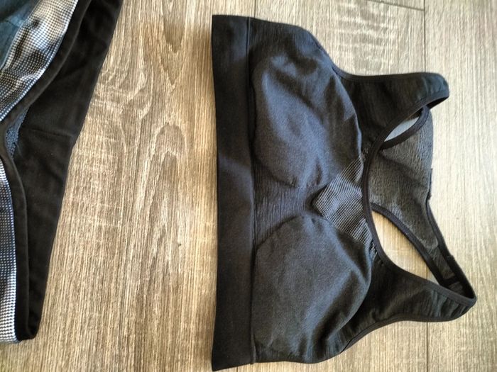 Leggings noir et gris Brassière de sport taille 36 Je donne l'autre legging car il a filé un peu niveau du derrière il a été réparé il peut encore dépanner c'est aussi du 36