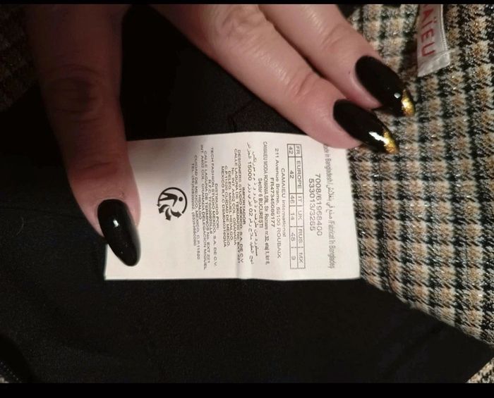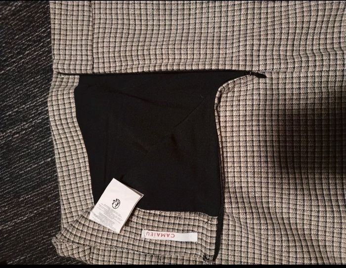 neuve sans étiquette, coupe légèrement évasée, rayures et carreaux noirs gris et dorés, taille 42 marque Camaïeu