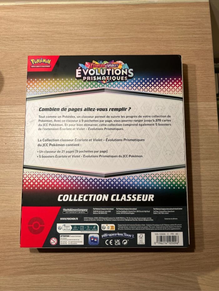 Coffret pokémon comprenant un classeur et 5 boosters pokémon de la collection Évolutions Prismatiques Boite légèrement abîmée en bas à droite, mais n’impacte absolument pas le coffret.