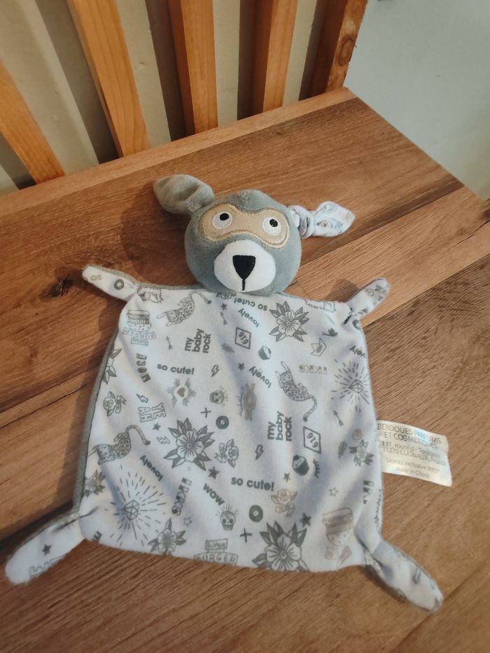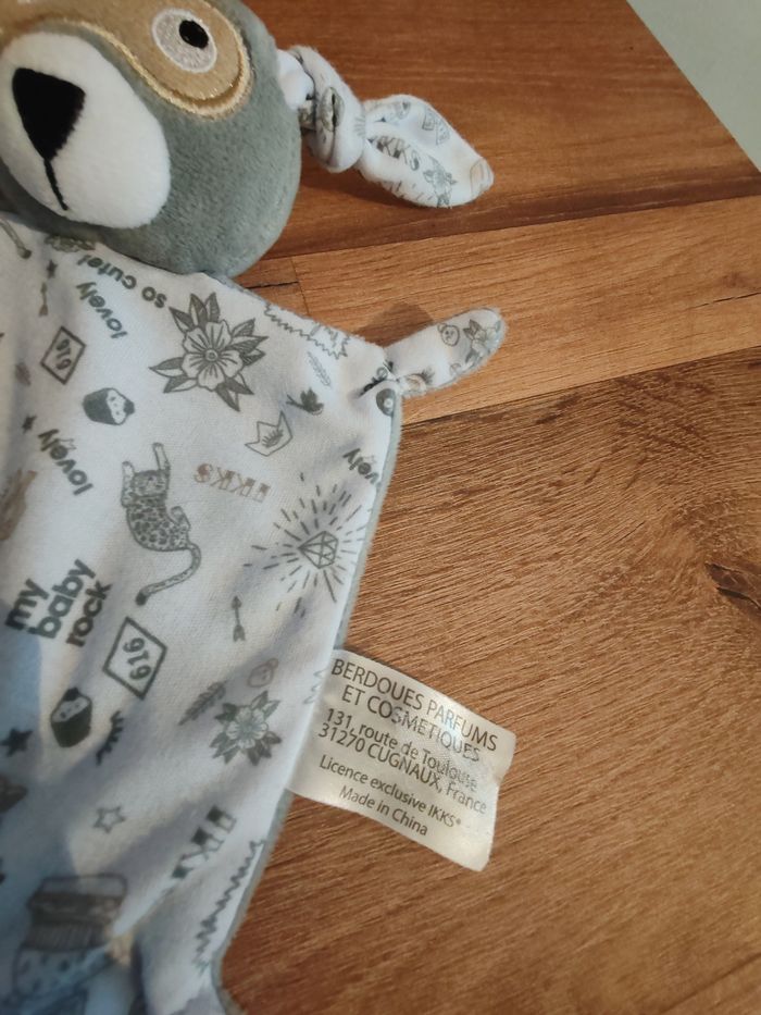 Doudou plat Lapin masqué gris blanc doré or lovely IKKS Étiquette presente Tbe 9.90 euros Envoi en relais