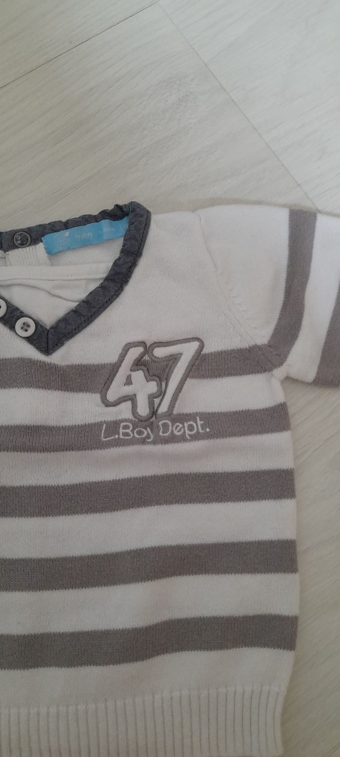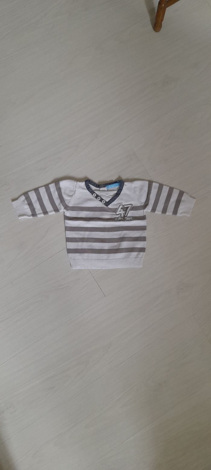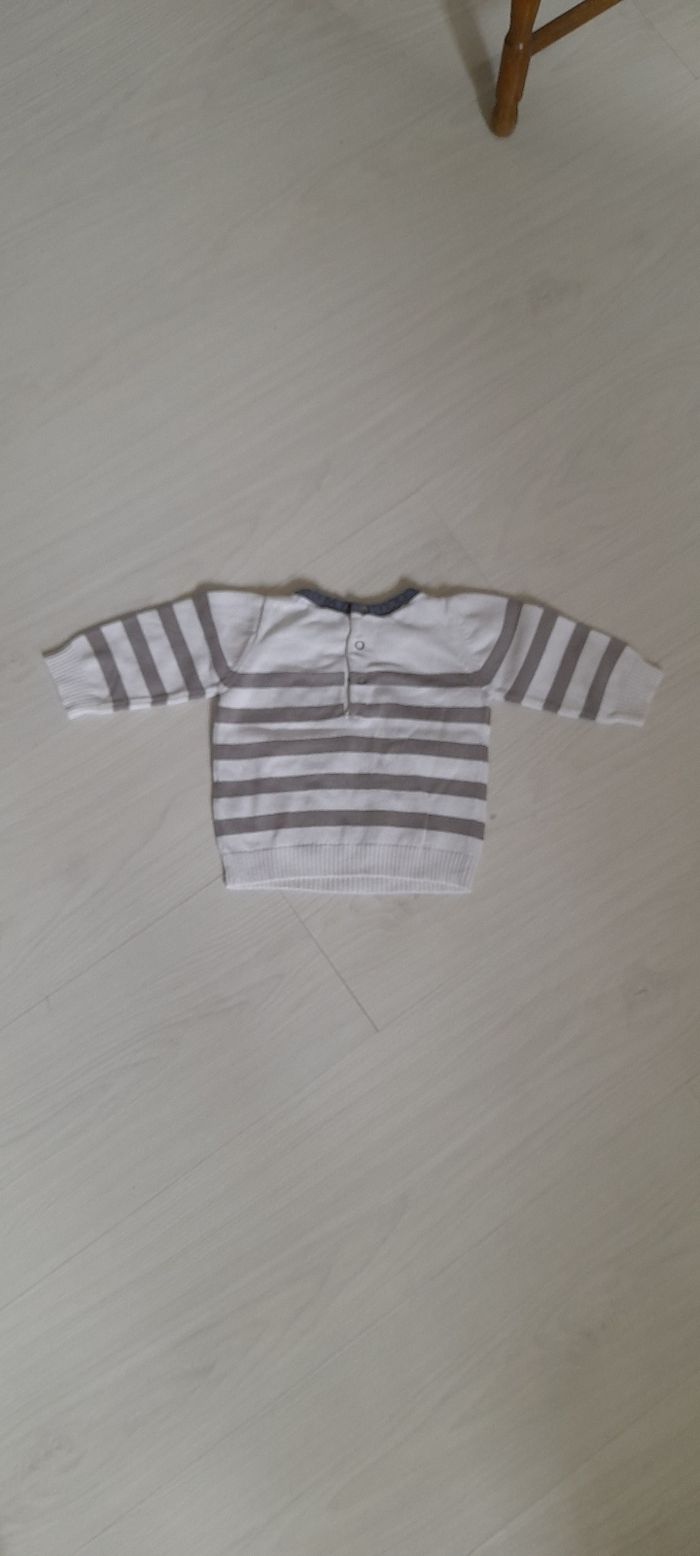Pull T 6 mois Marque GEMO Couleur blanc et gris avec liseré bleu Attache pressions mi dos Très très bon état