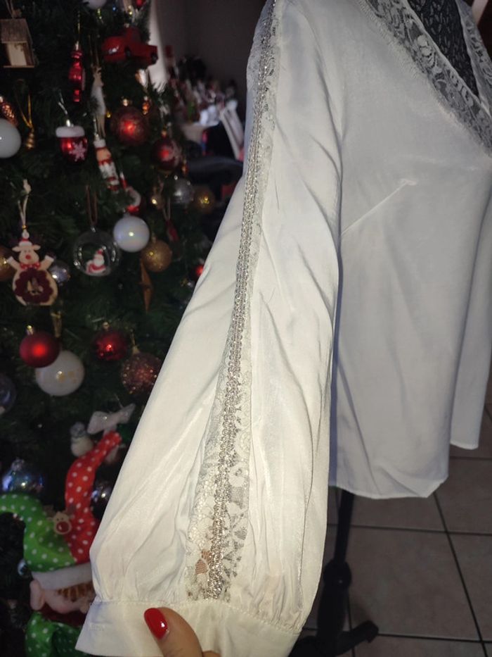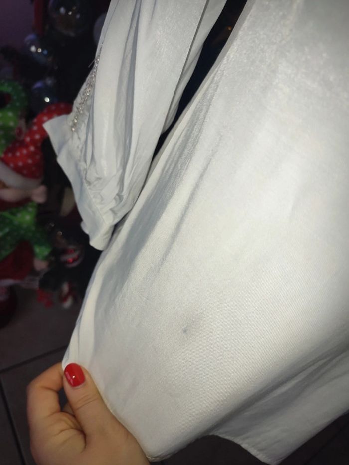 Blouse blanche petite tâche visible sur les photos taille S avec de la dentelle irisée sur le décolleté et les manches