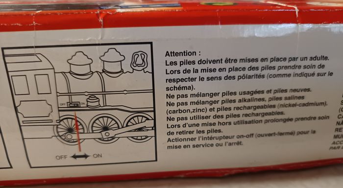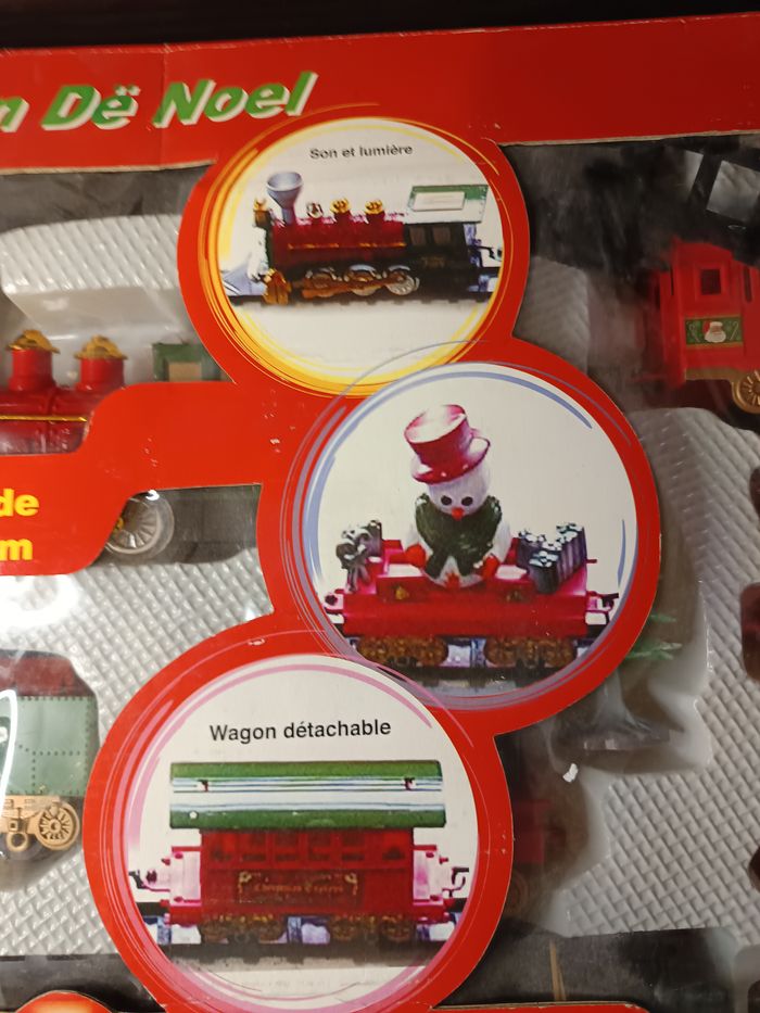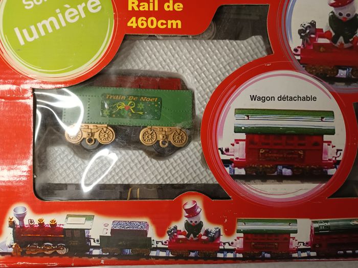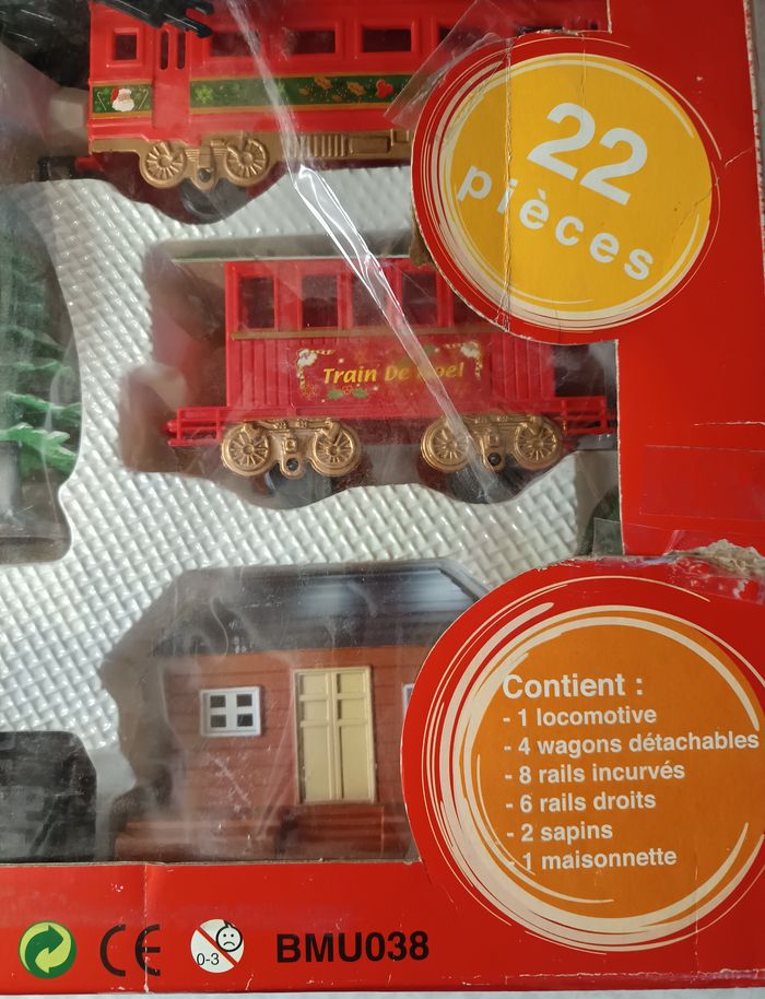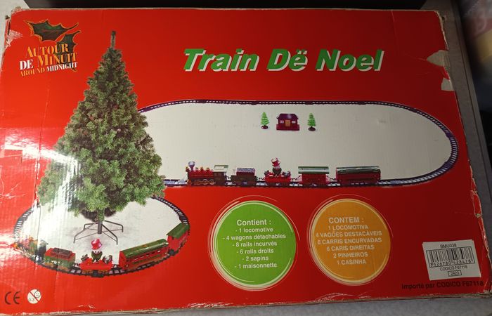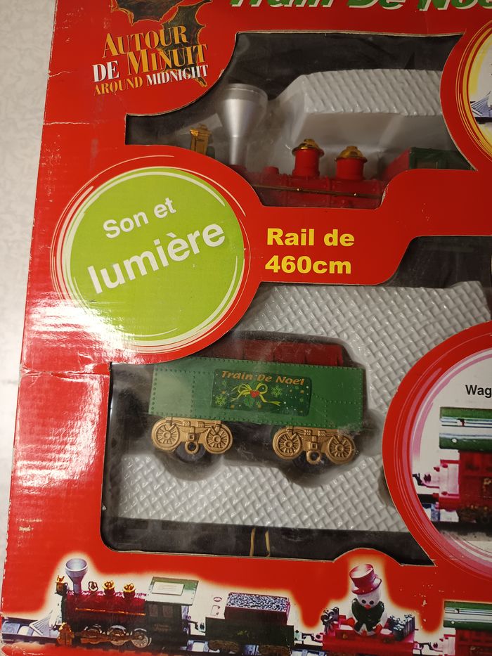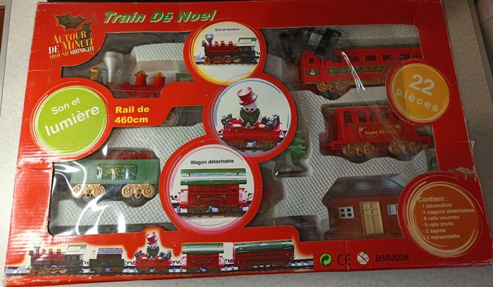 Thème: autour de minuit (around midnight) Boite (abimée) Complet Train de noël de 22 pièces contient: 1 locomotive 4 wagons détachables 8 rails incurvés 6 rails droits 2 sapins 1 maisonnette Des sons réalistes : le train émet des sons réalistes ainsi que un phare sur le devant qui illumine la piste lorsque votre train siffle autour de la base de votre sapin de Noël. Fonctionne avec des piles : le train festif fonctionne sur batterie et nécessite 2 piles AA pour fonctionner (non fournies).