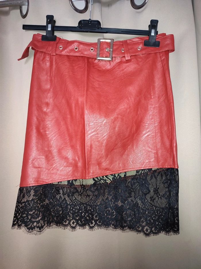 Jupe en simili cuir rouge foncé et dentelle noire vendu avec sa ceinture taille S, jamais porté 🌼