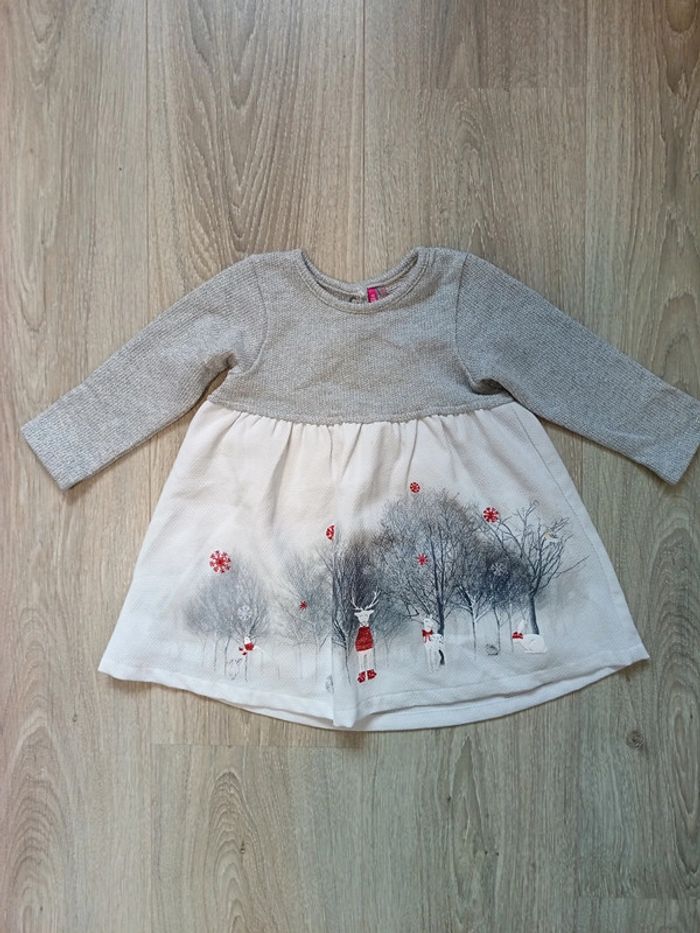 Robe de fête (Noël/réveillon) blanc gris avec cerfs flocons rouges, animaux 12 mois fille - photo numéro 1