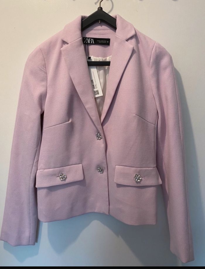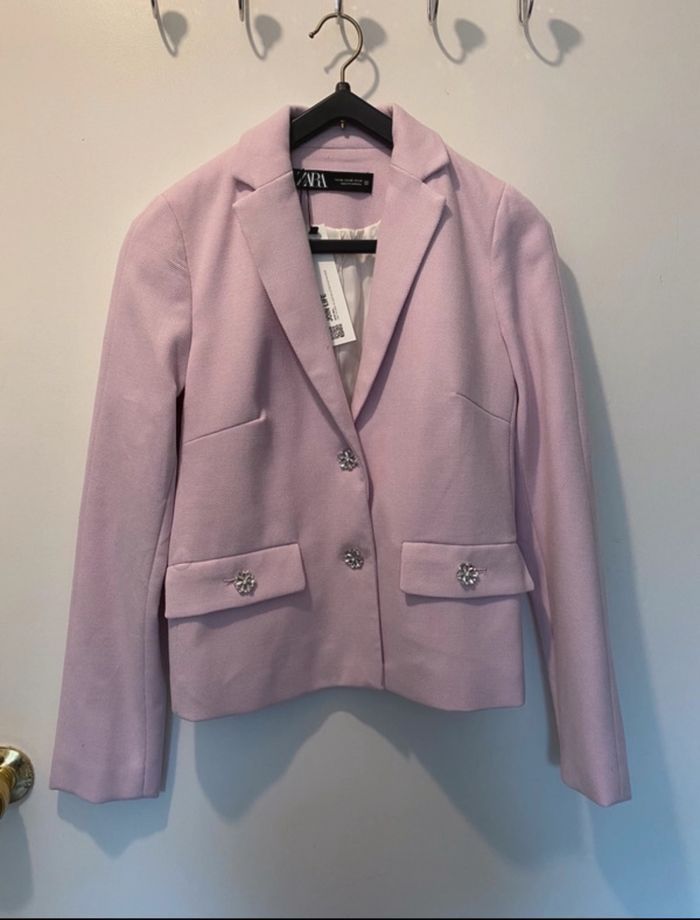Vente d'une superbe veste Zara, tout neuve, dotée de détails bijoux élégants qui ajoutent une touche de sophistication. 📐Taille :** XS ✨ 🎨Couleur :** Lila 💜 ✅Poches :** 2 poches pratiques 👜 🔖 Neuf avec étiquette 🏷️Prix de boutique:59,99€