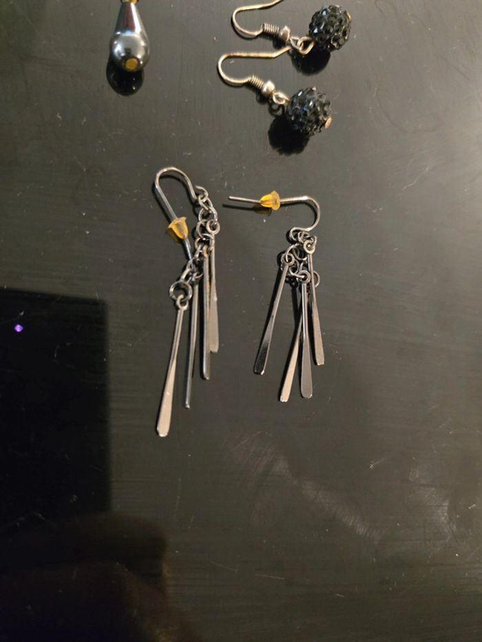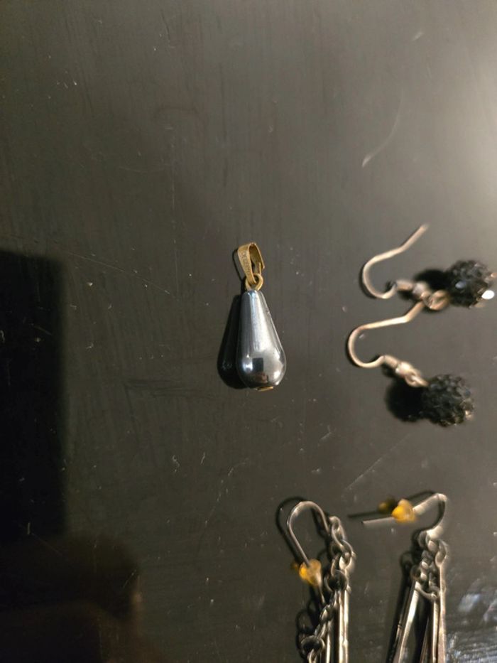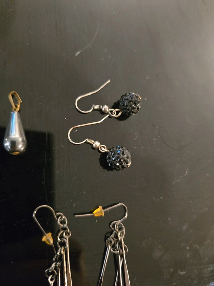 Lot en excellent état, cf photos 1 paire de boucles d'oreilles noires brillantes 1 pendentif argenté goutte 1 paire de boucles d'oreilles pendantes argentées