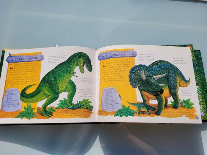 UN LIVRE ANIMÉ SEUIL JEUNESSE DINOPARC LA PRÉHISTOIRE EN 3D ET DES MODÈLES RÉDUITS DE DINOSAURES Ce livre jouet présente les dinosaures et le monde dans lequel ils évoluaient il y a 225 millions d'années. L'accent est mis sur le jurassique et sur le crétacé. Pour ces deux périodes, une illustration présente les différents dinosaures dans leur élément naturel, puis les espèces les plus représentatives et connues sont décrites dans les détails (diplodocus pour le jurassique ou tyrannosaure pour le crétacé). Enfin, le livre devient animé en s'ouvrant en quatre plateaux de jeu: l'aube et la tempête au jurassique, une journée et un volcan du crétacé. Pour jouer dans ces paysages en 3D, une quizaine de figurines des principaux dinosaures est placée dans une pochette à la fin du livre. Il suffit de les en libérer pour d'un coup faire revivre ces temps lointains! En très bon état, les dessous de 2 figurines ont été renforcés Mes livres par thème : #livredinosauresmooglou Mes autres livres enfants : #livreenfantmooglou