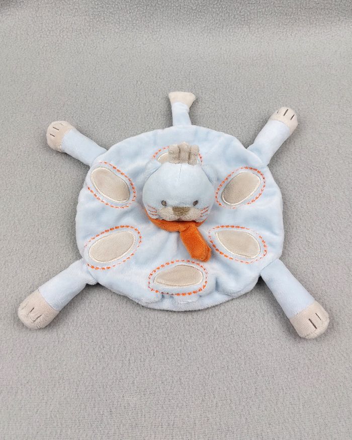 Doudou plat rond chat KIMBALOO LA HALLE bleu gris écharpe orange TTBE - photo numéro 2