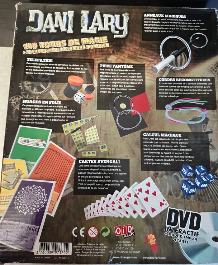 Réalise 100 tours de magie et découvre en compagnie de Dani lary 7 extraordinaires accessoires initiation à la magie professionnelle, un code tuto est inclus pour les vidéos explicatives, ainsi qu'un accès au module découverte de notre école de magie. Inclus également 50 illusions d'optique et chapeau magique double fond. Age : À partir de 7 ans