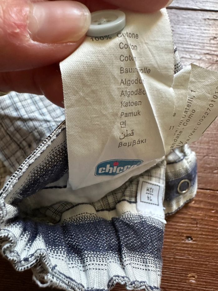 Short Chicco à carreaux bleu et beige. Fermeture par un bouton pression. 100% coton. Très bon état. Envoi rapide et soigné.