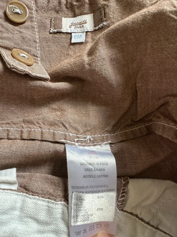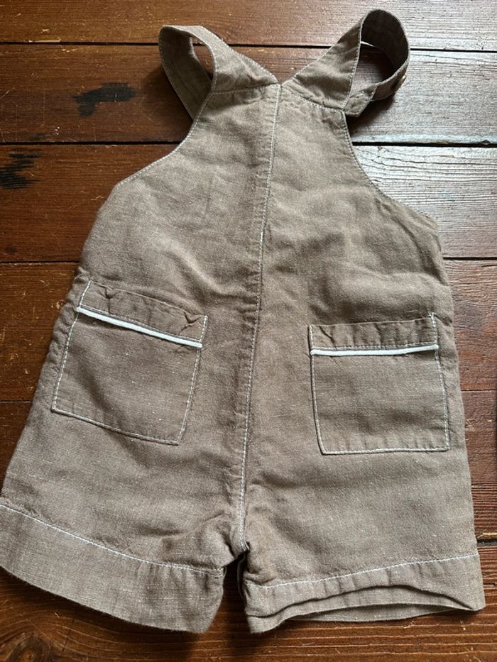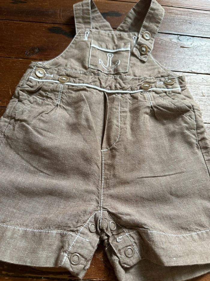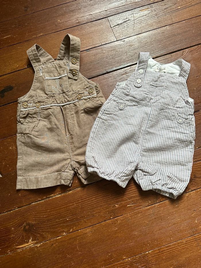 Lot de 2 salopettes taille 6 mois. Jacadi marron clair en lin, ouverture entrejambes par des boutons pression. Cyrillus finement rayée bleu, rouge, blanc avec ouverture entrejambes par des boutons pression. Très bon état.