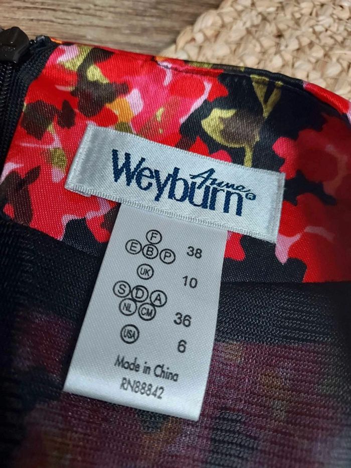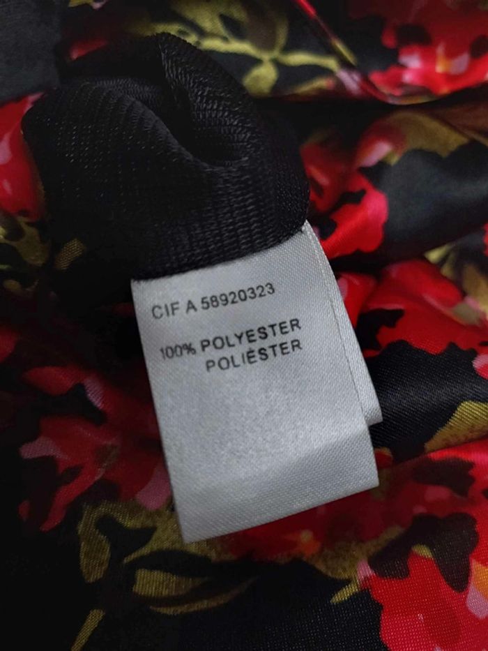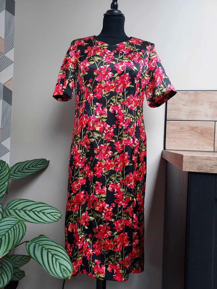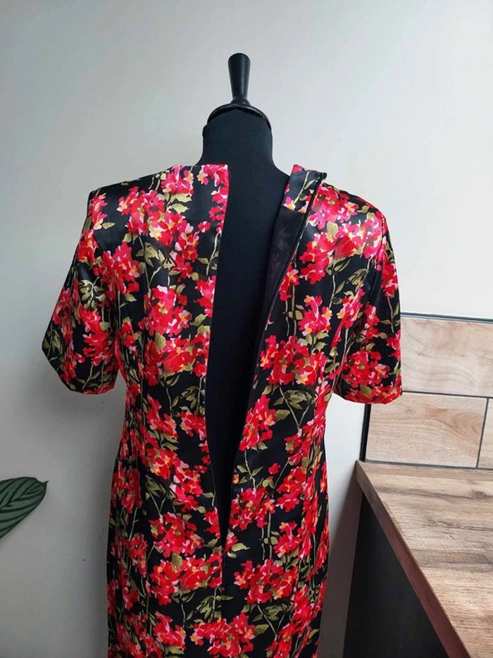 Taille 38 Fermeture éclair à l'arrière Fleurs rouges sur fond noir Manches courtes Doublée sauf aux manches Épaulettes Longueur du bas de l'épaule jusqu'en bas 101 cm Réductions possibles sur lot sur demande #anneweyburn #robemilongue38 #robefleurie