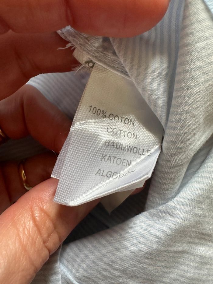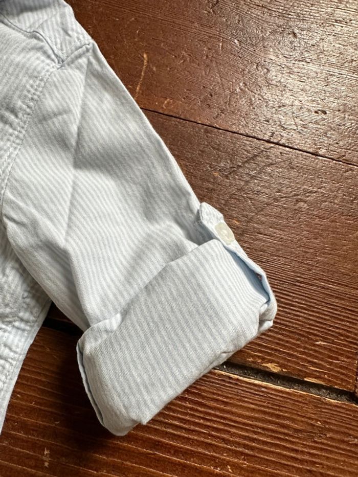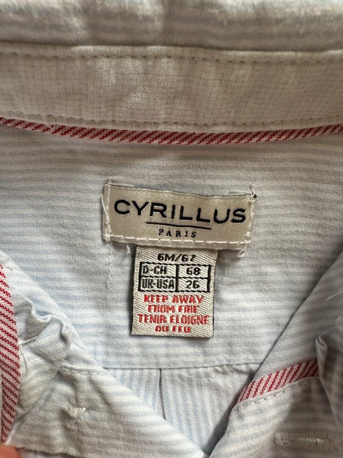 Chemise Cyrillus finement rayée bleu ciel et blanc. Possibilité de remonter les manches longues avec un bouton (voir photos). Taille 6 mois. 100% coton. Très bon état. Envoi rapide et soigné.