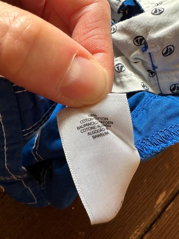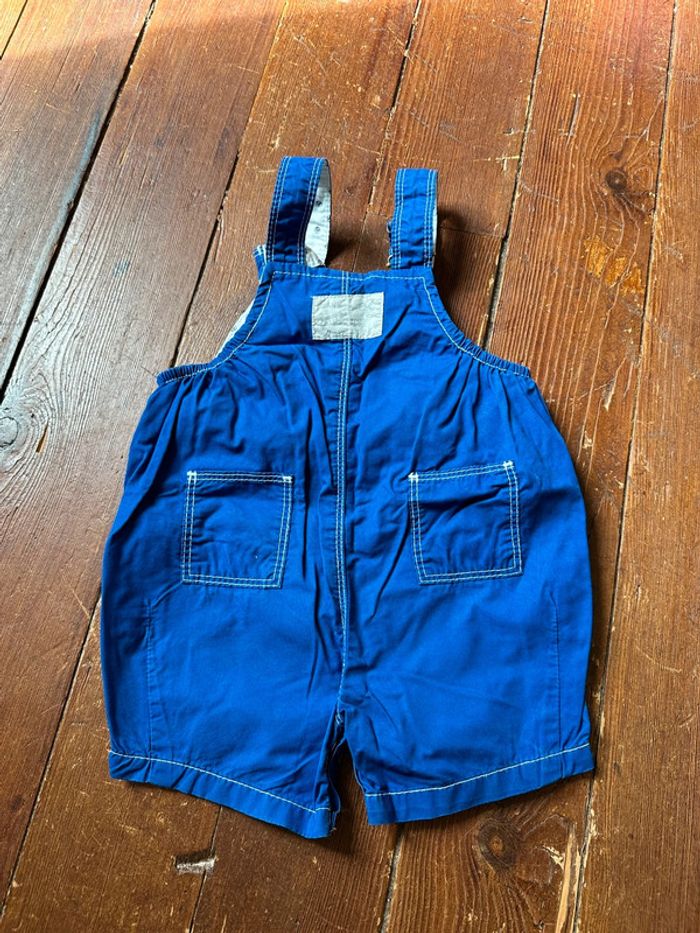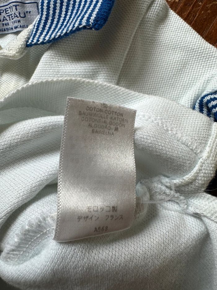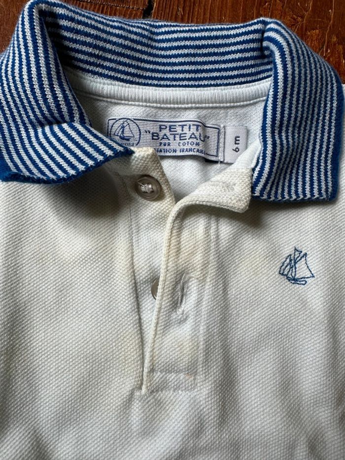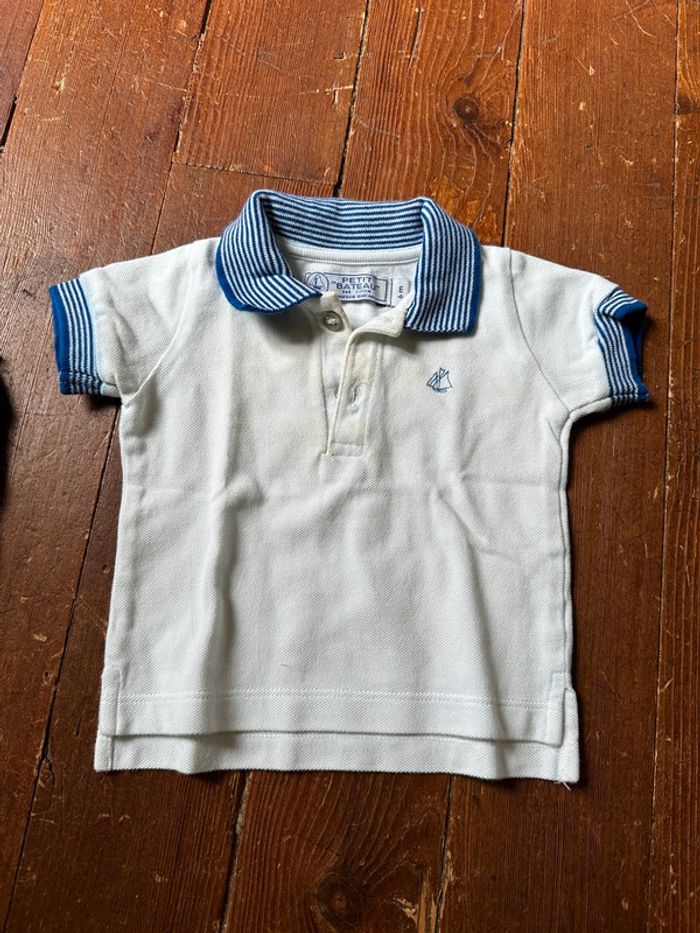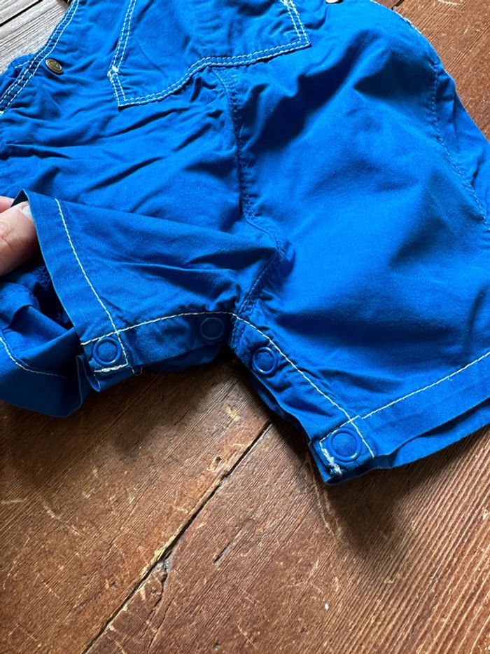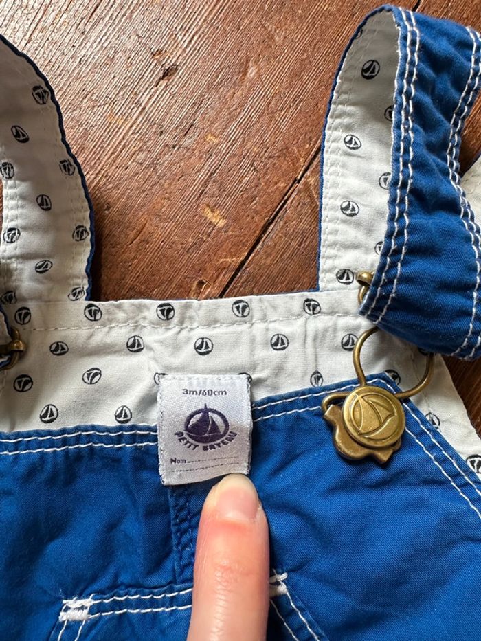 Ensemble Petit Bateau bleu 100% coton. La salopette est en taille 3 mois (60 cms) et en très bon état. Le polo en taille 6 mois (67 cms) taille petit. Le tissu du polo est en bon état à part une petite tache sous l’encolure visible sur photos. Envoi rapide et soigné.