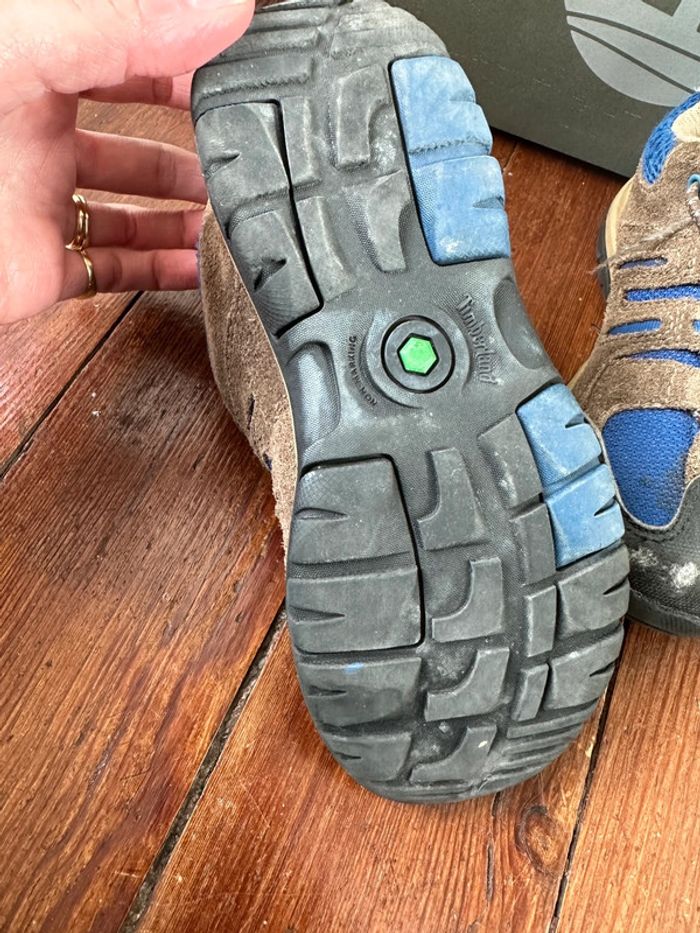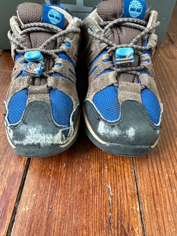 Chaussures de marche Timberland marrons et bleues. Le bout est un peu usée mais l’ensemble est en très bon état. Envoi rapide et soigné dans leur boîte d’origine.