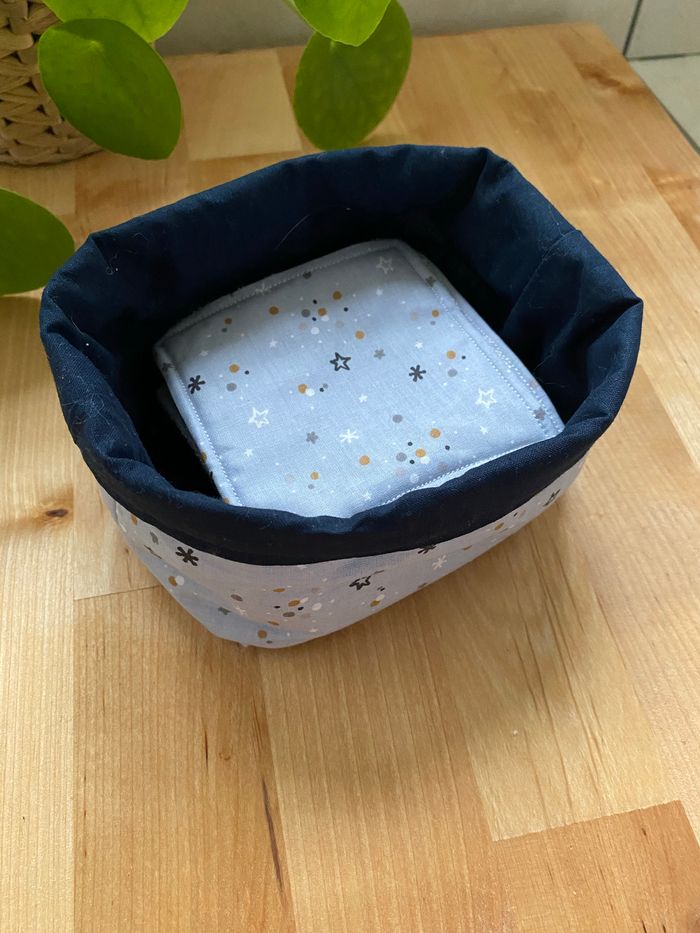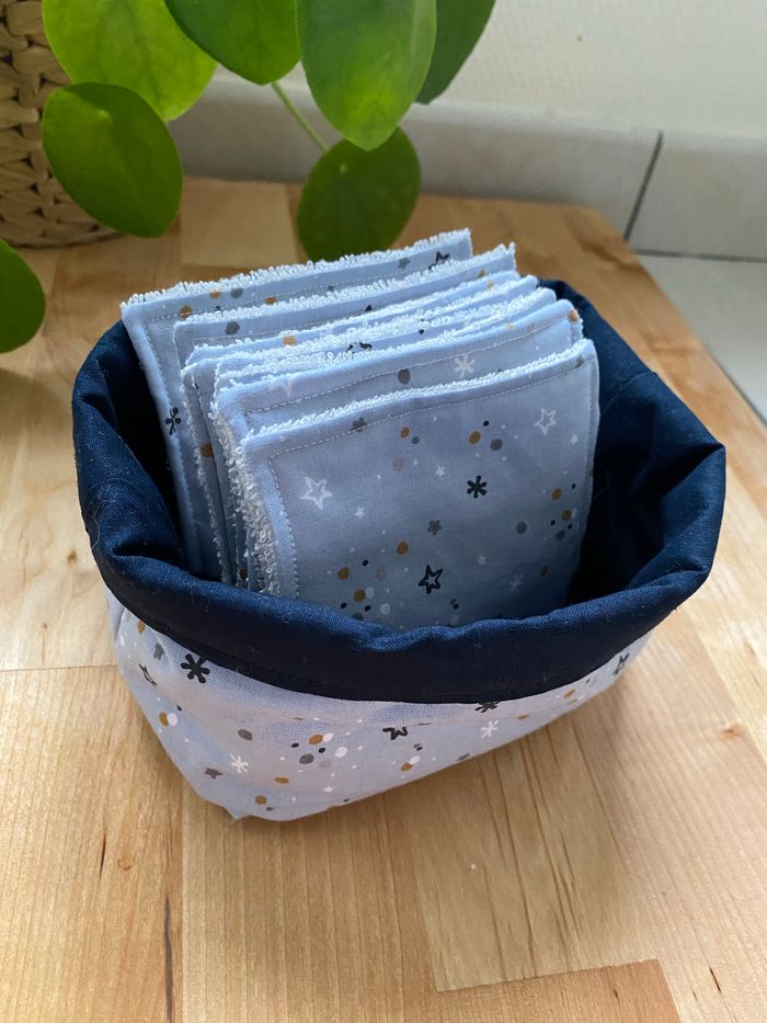 Je vends ce lot de 10 lingettes lavables + panier de rangement Dimensions lingettes 9,5/10cm environ, côté éponge ou doux au choix Fait main, possibilité d’ajouter des lingettes au lot ( n’hésitez pas à me demander ) Tissus éponge bambou + coton 15€ le lot de 10 lingettes + panier