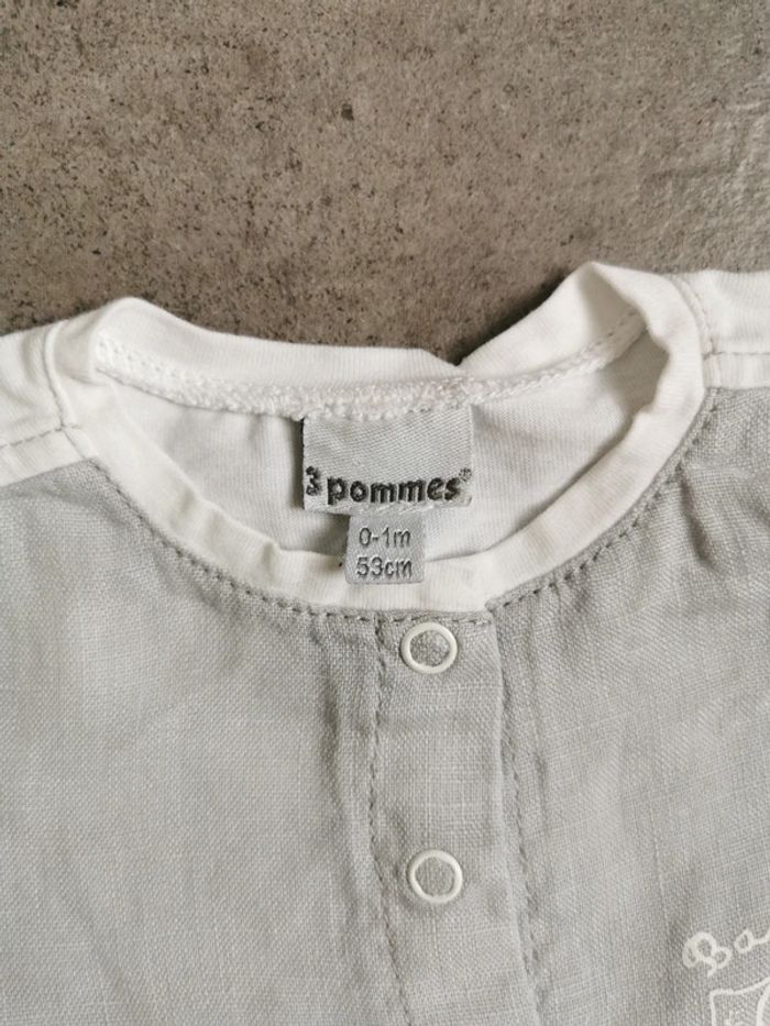 Combinaison été neuve 1 mois de chez 3 pommes. Mon bébé n'a porté aucun vêtement été en 1 mois car le temps ne s'y prêtait pas. Ils sont donc neuf mais lavé.