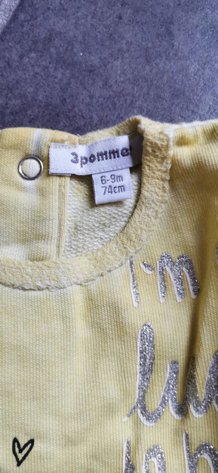 Pull tunique, marque 3 pommes, taille 6-9mois. Très peu porté. Jaune